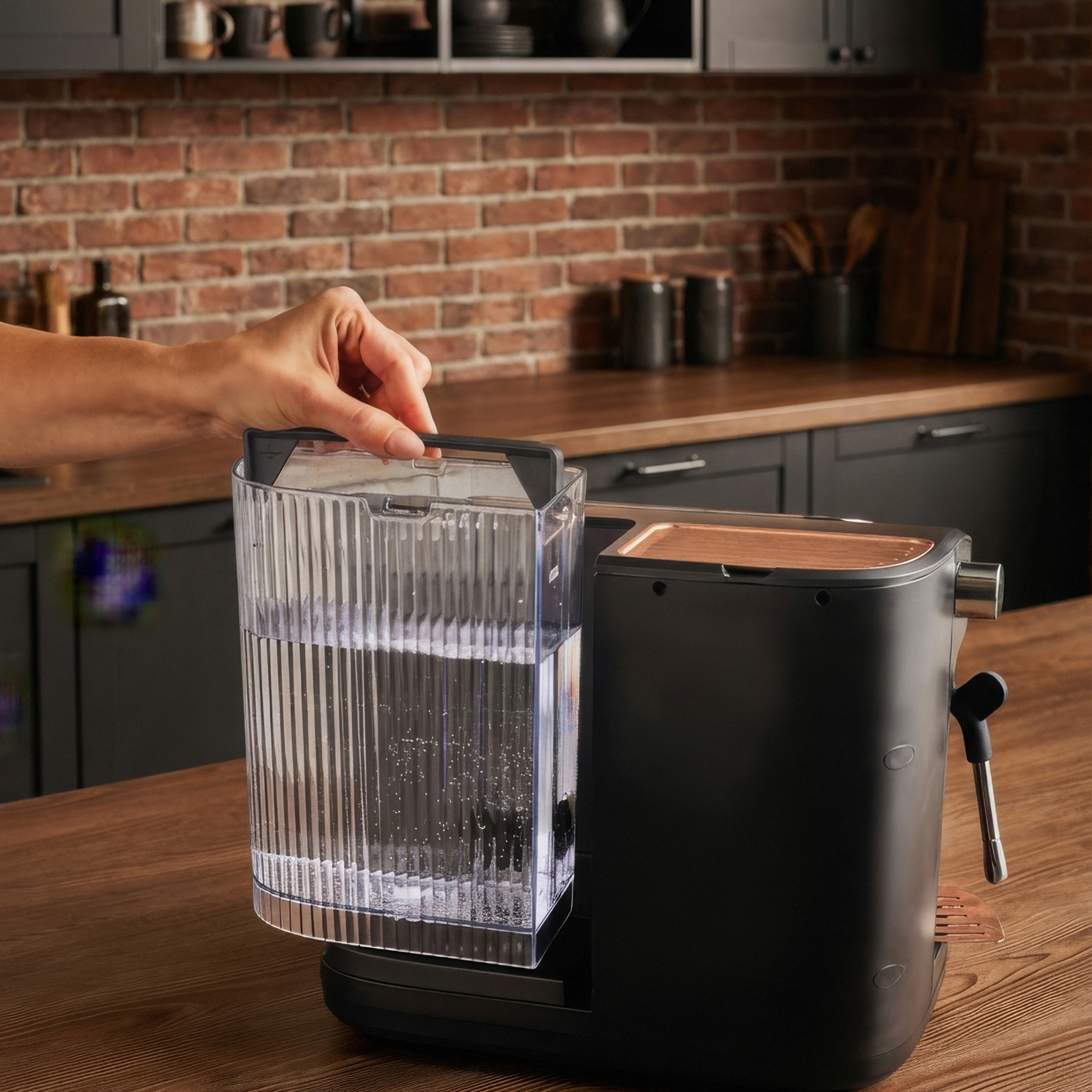 Yan bölümde konumlandırılan süt köpürtücü, cappuccino ve latte hazırlığında ihtiyaç duyulan köpük yoğunluğunu elde etmek için tasarlandı. Çevrilebilir buhar düğmesi, sütün dokusunu kullanıcının tercihine göre ısıtma veya köpürtme imkânı sunan kontrollü bir yapı oluşturdu.