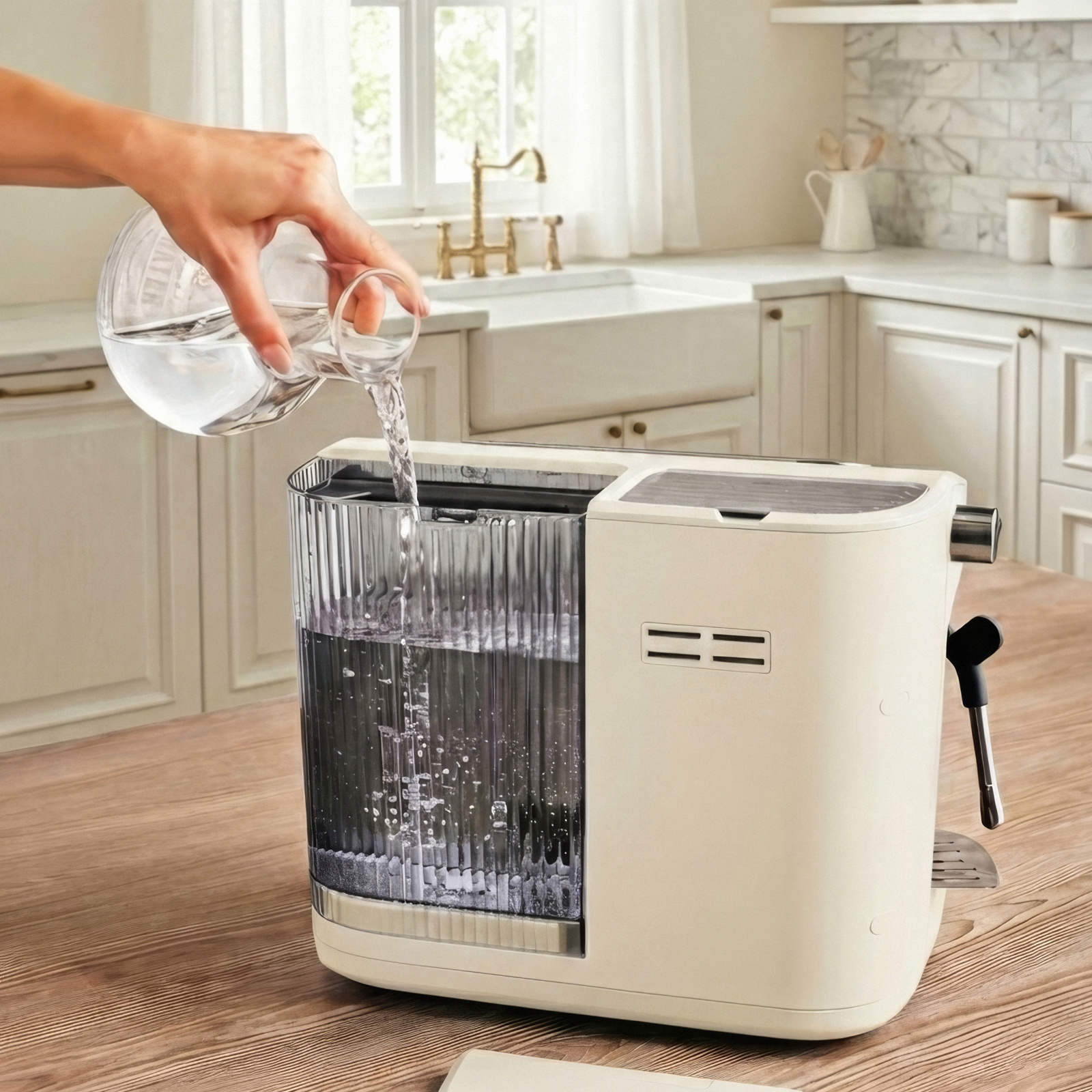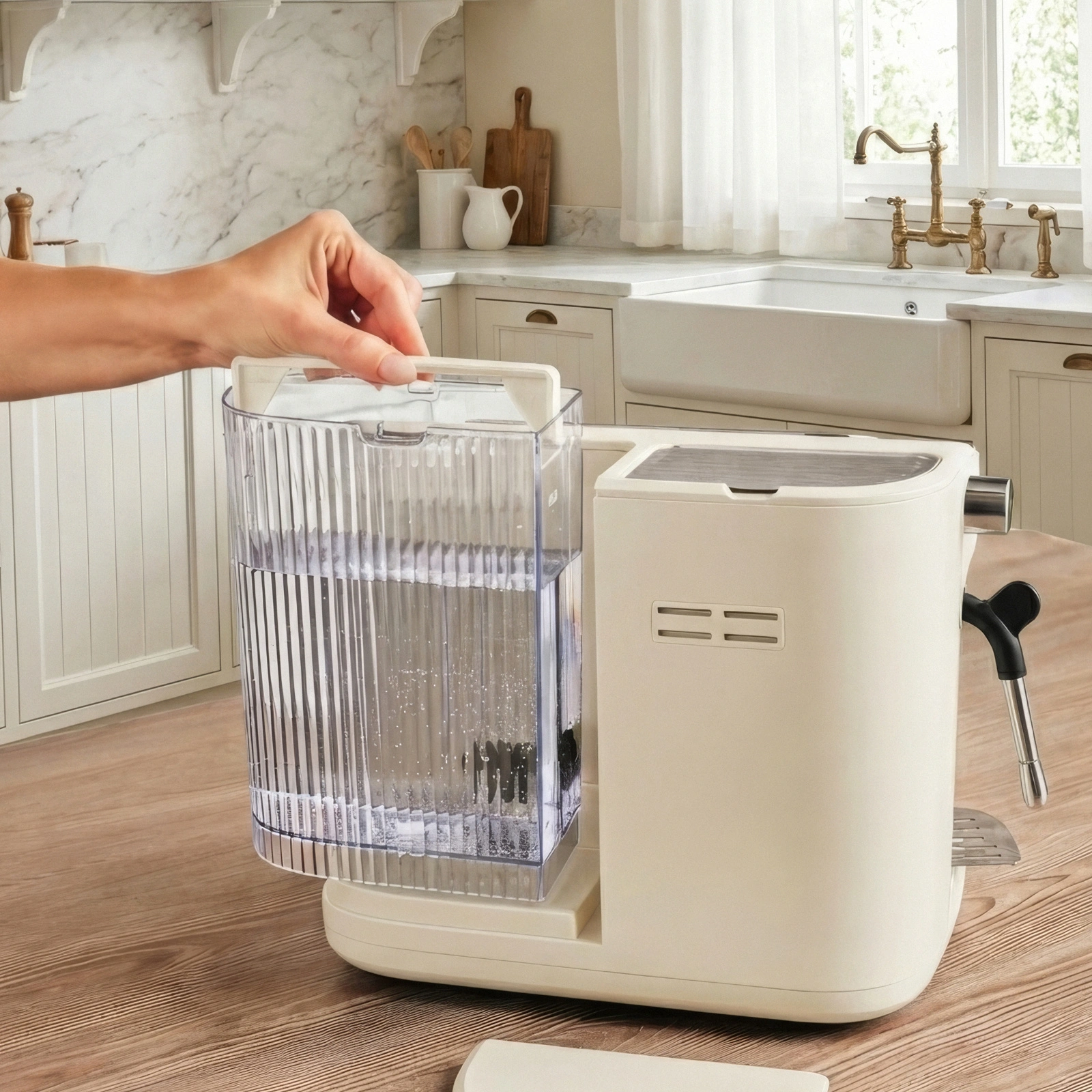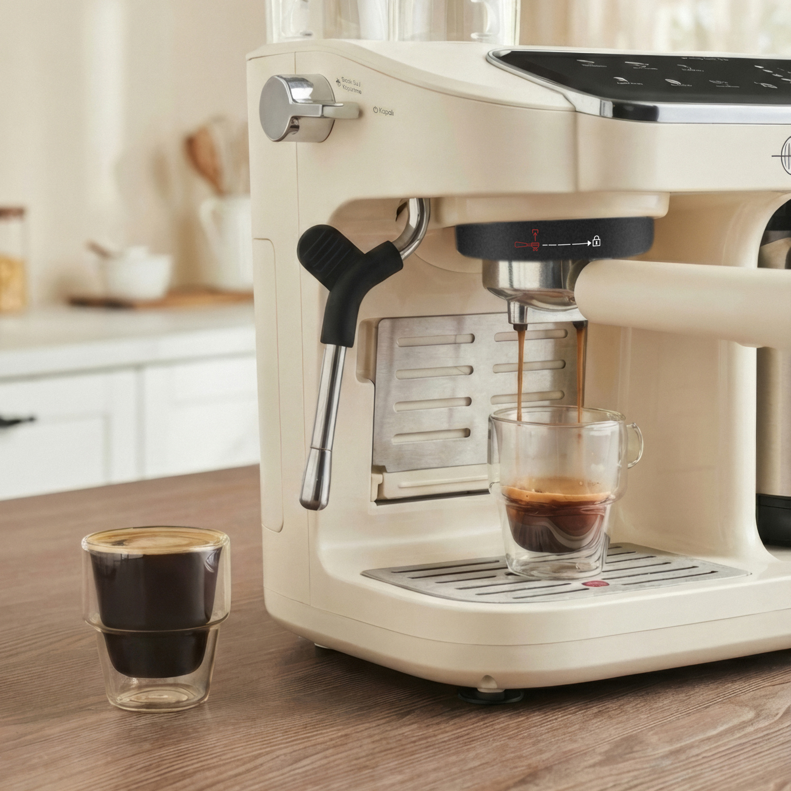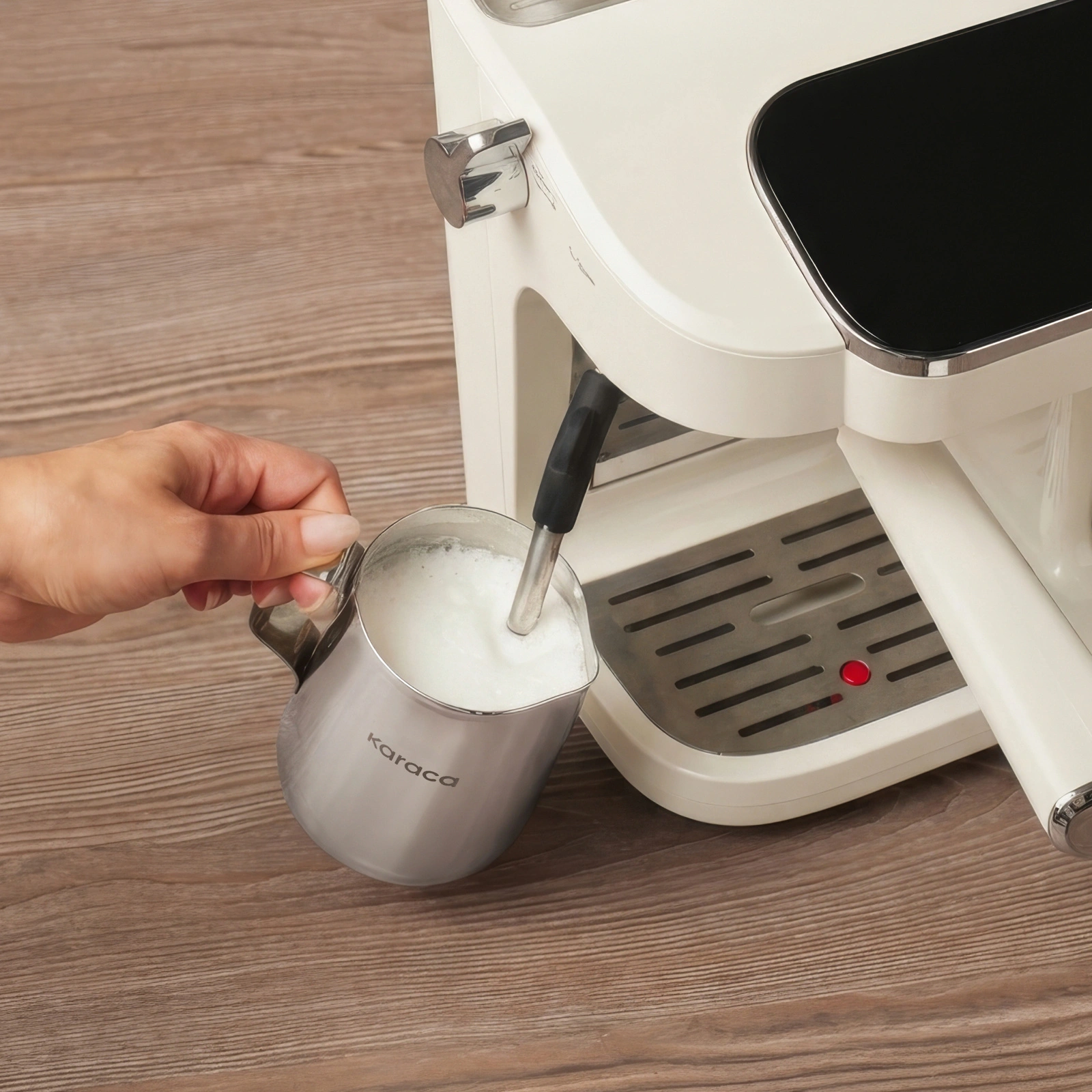 Yan bölümde konumlandırılan süt köpürtücü, cappuccino ve latte hazırlığında ihtiyaç duyulan köpük yoğunluğunu elde etmek için tasarlandı. Çevrilebilir buhar düğmesi, sütün dokusunu kullanıcının tercihine göre ısıtma veya köpürtme imkânı sunan kontrollü bir yapı oluşturdu.