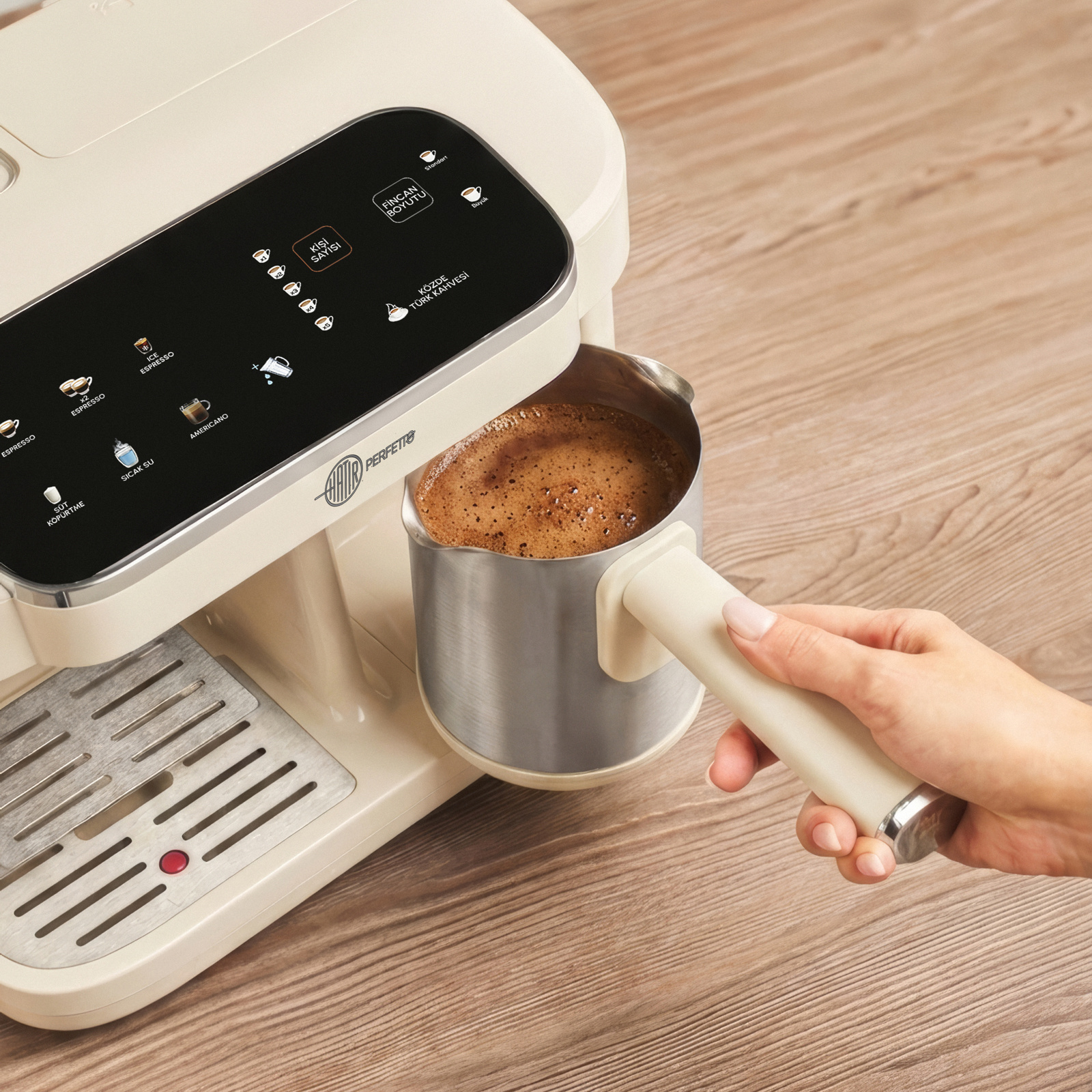 Evet. Hatır Perfetto, dünyada ilk kez Türk kahvesi ve espressoyu aynı gövdede bir araya getiren bir makinedir. İki bağımsız demleme sistemine sahiptir ve aynı anda farklı kahve türlerini hazırlamanıza olanak tanır. Örneğin bir tarafta Türk kahvesi hazırlanırken diğer tarafta Espresso yapabilirsiniz.