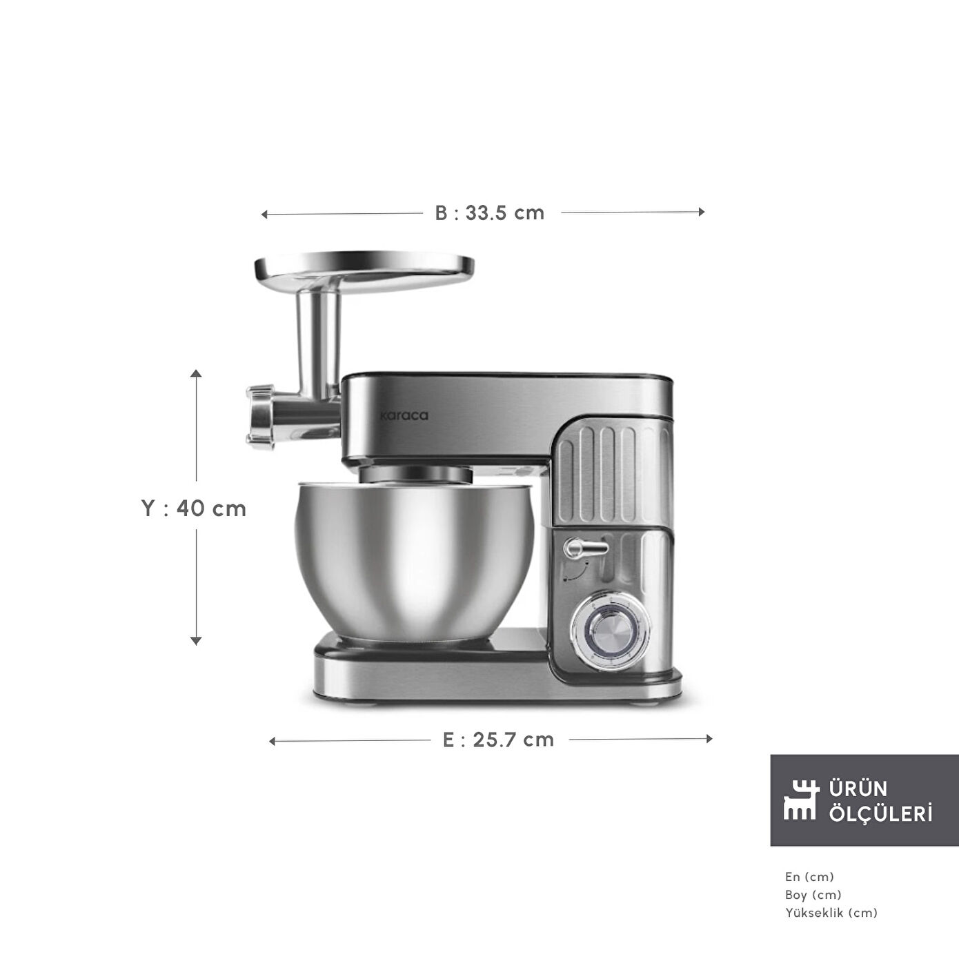 Karaca Inoxchef Pro Stand Mikser, 1300W gücündeki motoru ile güçlü ve verimli bir kullanım sunar. Sadece çırpma, karıştırma ve yoğurma işlemlerinde değil, kıyma çekme, sucuk-sosis yapma ve köfte hazırlama işlemlerinde de mükemmel bir yardımcıdır. 3 farklı kıyma aparatı ve ekstra dayanıklı yapısı sayesinde geniş mutfak işlerini rahatlıkla halledebilirsiniz. 7 litrelik paslanmaz çelik haznesi, büyük miktarlardaki karışımları dahi hızla hazırlar. Şeffaf sıçrama önleyici kapağı ve 6 kademeli hız ayarıyla güvenli bir kullanım sağlar. Bu çok amaçlı mikser, düşük eforla hamur yoğurma, yumurta çırpma ve nefis kekler yapma konusunda uzmanlaşmıştır. Aparatlarıyla kıyma makinesi haline de gelebilen bu profesyonel mutfak ürünü, enerji ve zamandan tasarruf etmek isteyenler için vazgeçilmezdir.