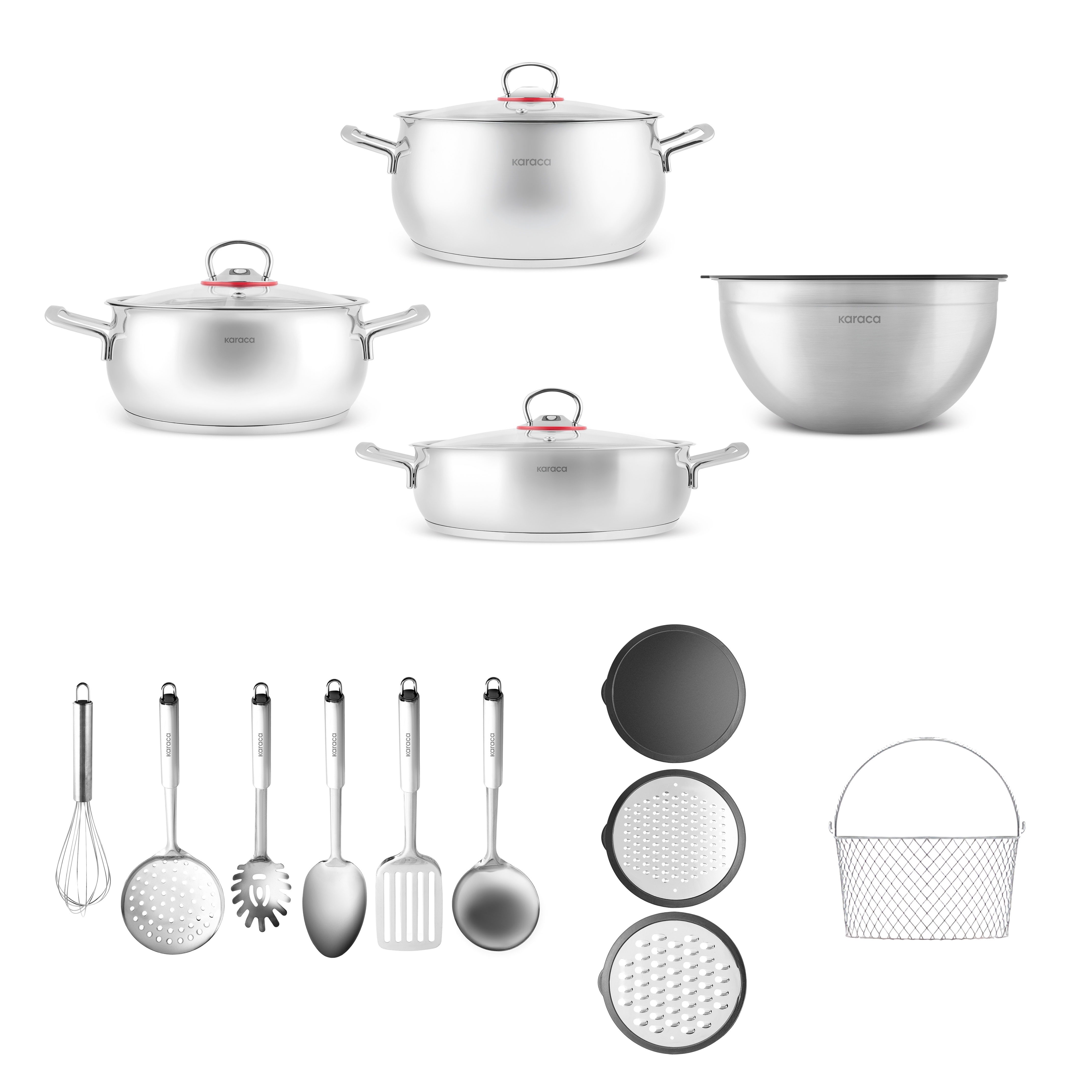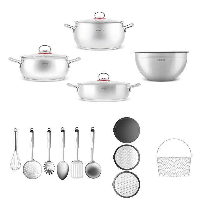 Karaca Karıştır-Pişir-Sakla 18 Parça Karıştırma Kabı ve Servis Gereçli Çelik Tencere Seti