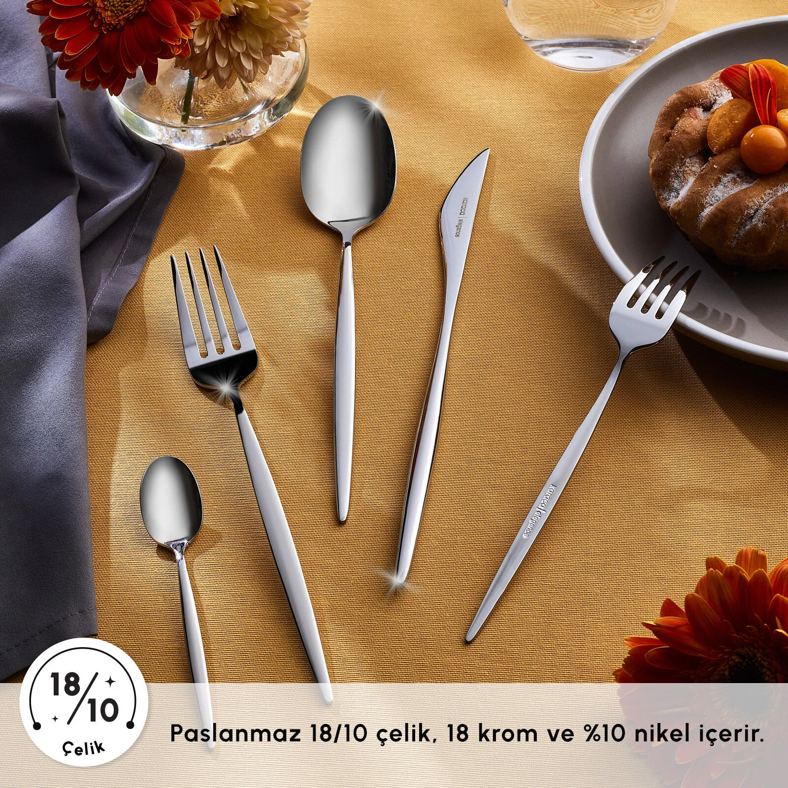 Üstün Kalite Malzeme: 18/10 paslanmaz çelikten üretilmiş olan bu takım, paslanmaya, çizilmeye ve kararmaya karşı yüksek direnç gösterir.