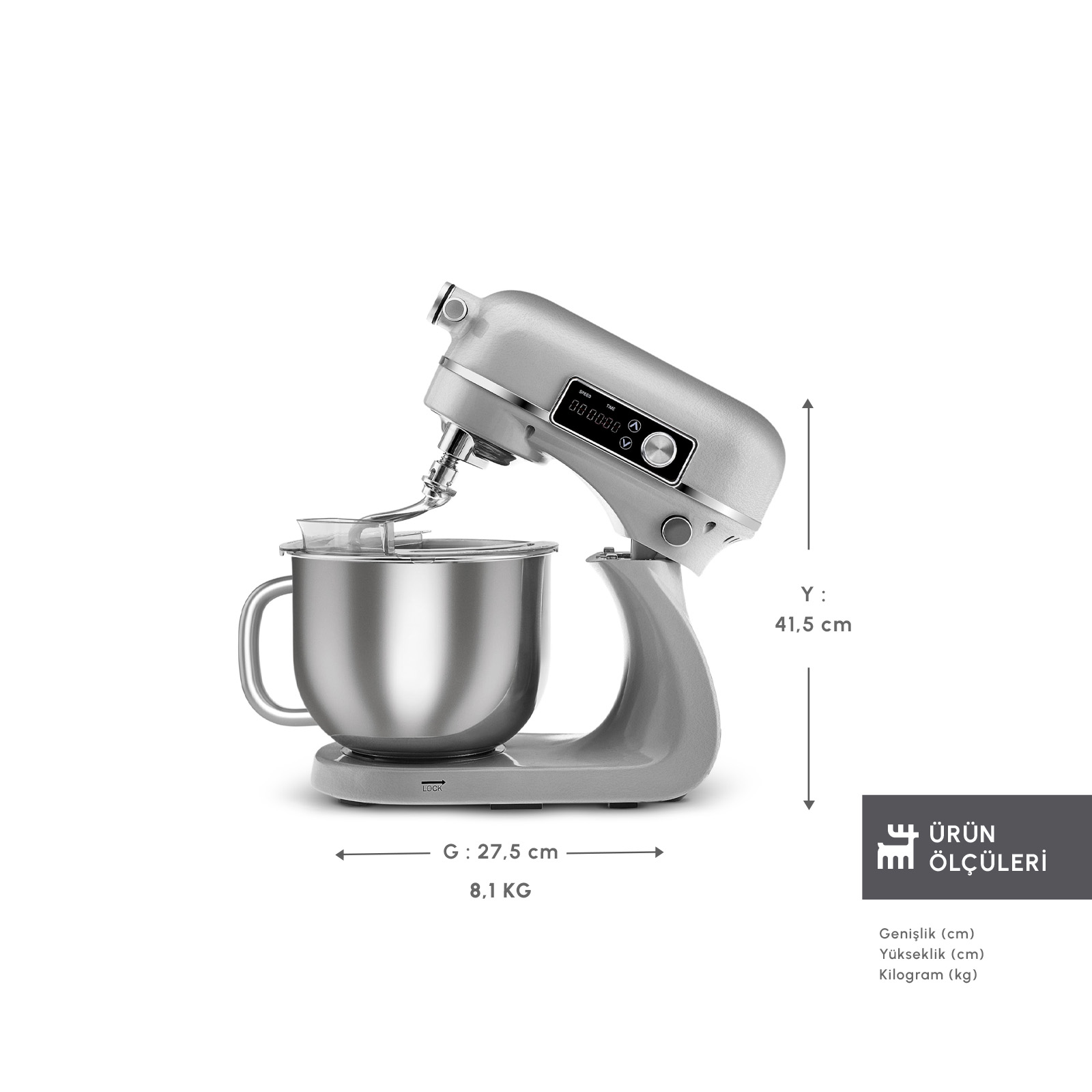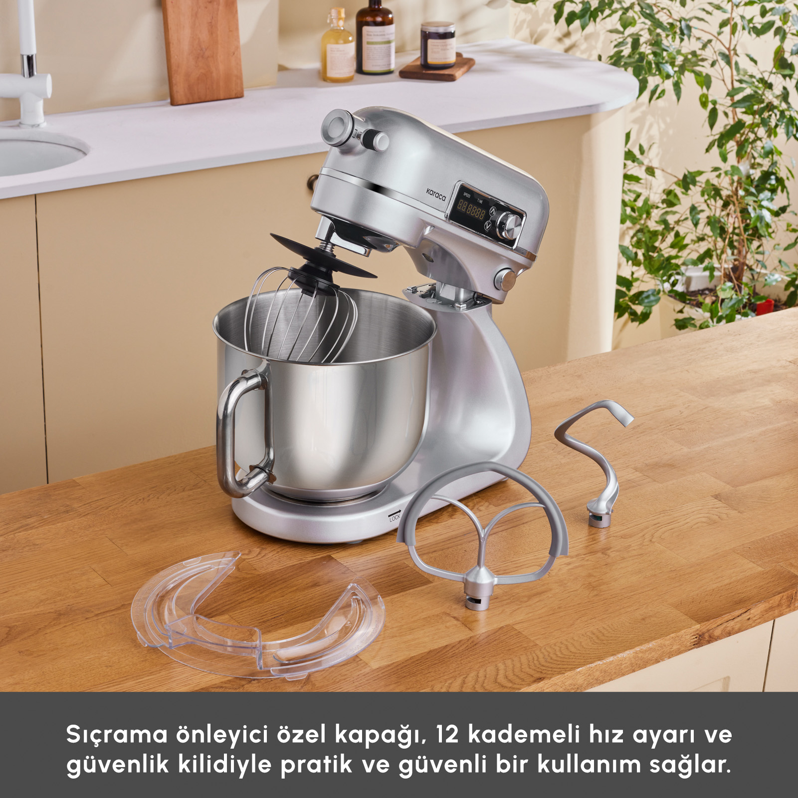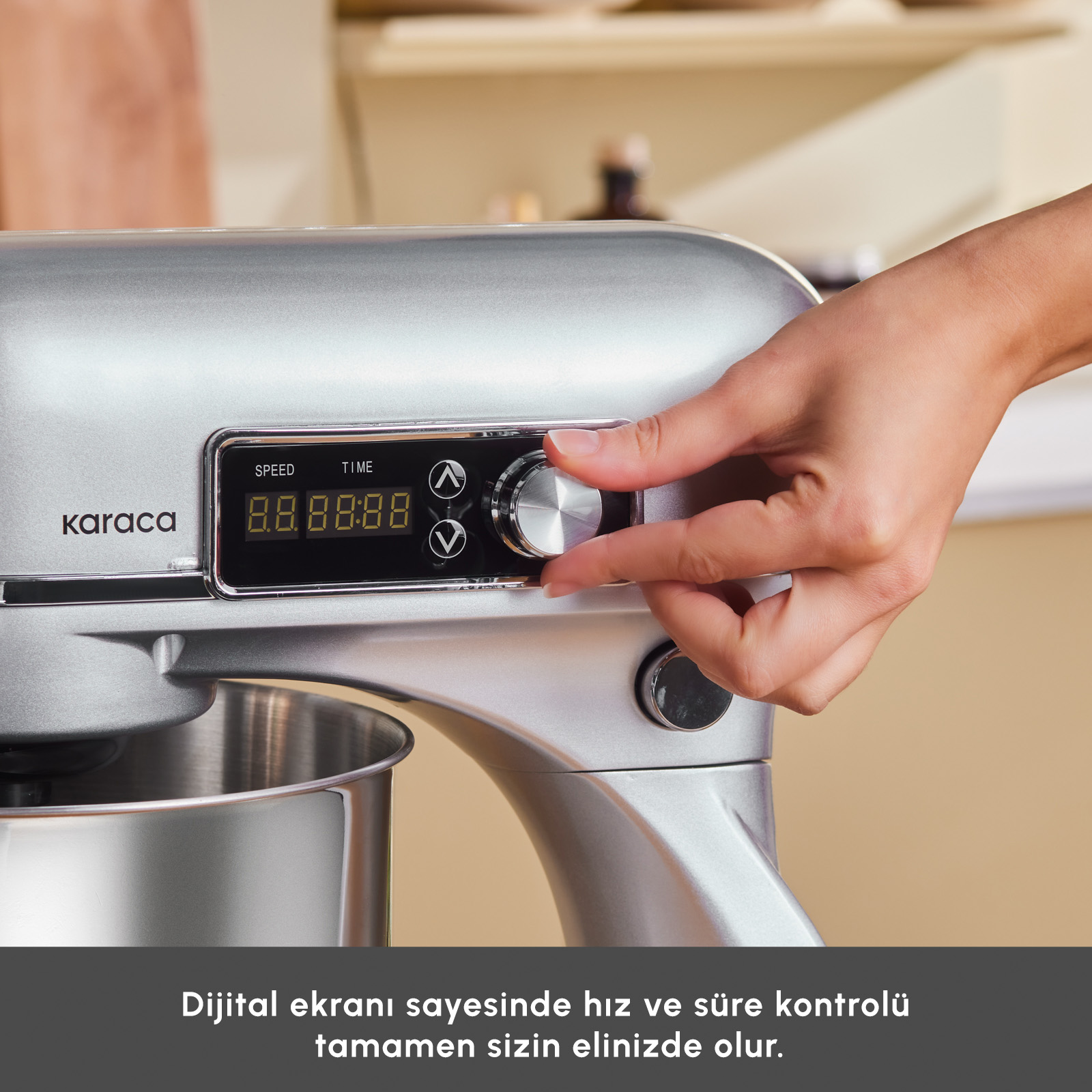 Karaca Maestro Artisan Dijital Ekranlı Döküm Stand Mikser, sahip olduğu üç farklı aparatı ile çırpma, karıştırma ce yoğurma gibi işlemler ideal şekilde yapar. 6L kapasiteli paslanmaz çelik haznesi ile büyük ölçekli karışımları hızlı ve pratik bir şekilde hazırlarken, kulbu sayesinde rahatça kavrama ve hareket kolaylığı sağlar. Haznesi paslanmaz çelik, gövdesi dayanıklı dökümdür. Hız ve zaman ayarlı ekranı ile çalışma hızını ve süreyi dilediğinizce ayarlayabilirsiniz. Bu süre boyunca hamurunuzu otomatik karıştırır ve başında beklemenizde gerek kalmadan hamurunuzu dilediğiniz kıvamda hazırlar. Sıçrama önleyici özel kapağı, 12 kademeli hız ayarı ve güvenlik kilidiyle pratik ve güvenli bir kullanım sağlar. Sabitleyici ayaklar sayesinde rahat ve kontrollü kullanılır, işlem esnasında tezgahta kaymaz.