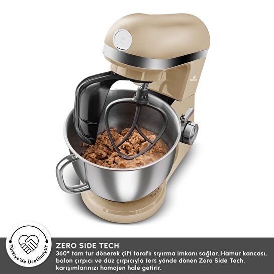 Mastermaid Chef Pro, Zero Side Tech ile 360 derecelik tam turla dönerek çift taraflı sıyırma imkânı sağlıyor. Hamur kancası, balon çırpıcı ve düz çırpıcıyla ters yönde dönen Zero Side Tech, karışımlarınızı çok daha homojen hale getiriyor. Saklama kapağı, mayalı hamurlarınızı ve karışımlarınızı başka bir kaba taşımadan kendi haznesi içerisinde muhafaza etmenize yardımcı oluyor. Tüm malzemeleri sıçratmadan karıştırmanıza olanak tanıyan sıçrama önleyici kapakla da tezgahlar hep tertemiz. Üstelik kapak üzerinde bulunan beslenme ağzından malzeme eklemesi yapabilir, bulaşık makinesinde kolayca yıkanan mikser haznesiyle temizliği düşünmeden lezzetin tadını çıkarabilirsiniz.