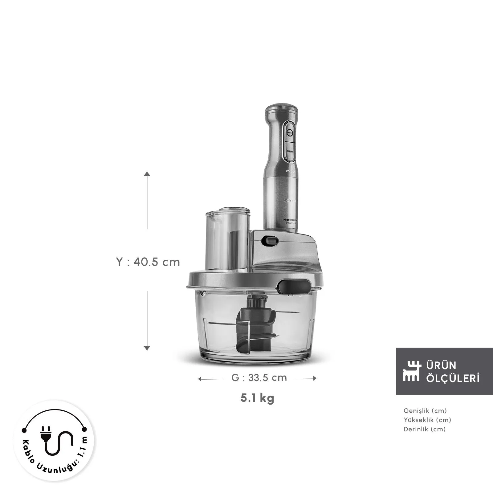 - Ekstra uzun blender ayağı sayesinde çok derin tencerelerde bile kolayca karıştırma ve püre haline getirme işlemi yapabilirsiniz.