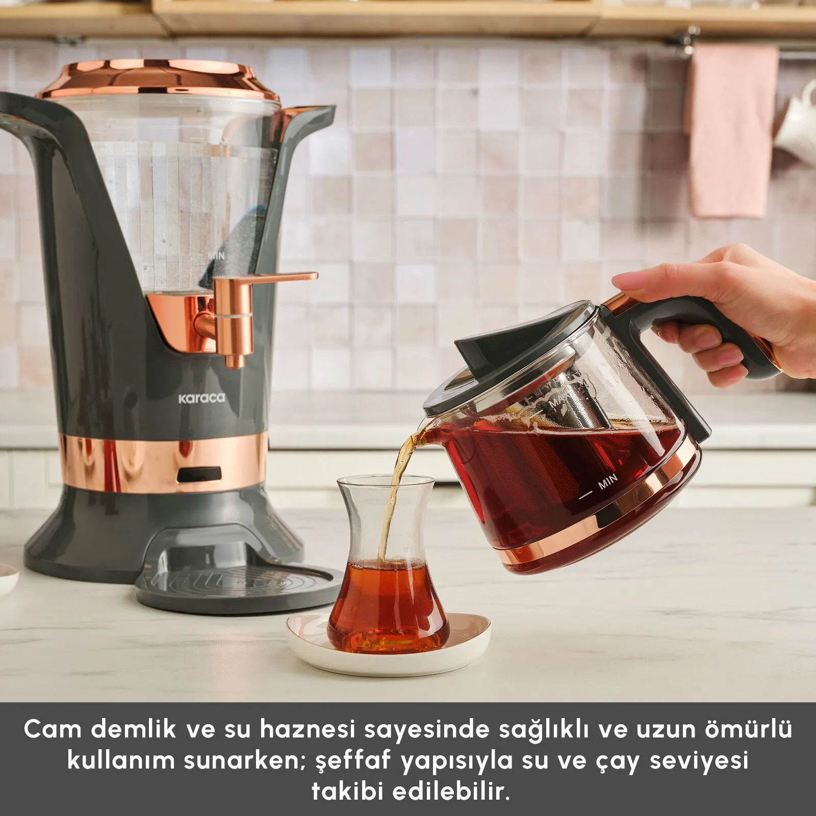 Cam demlik ve cam su haznesi sayesinde sağlıklı, dayanıklı ve uzun ömürlü kullanım sunar. Şeffaf yapısı ile su ve çay seviyesini kolayca görmenizi sağlar.