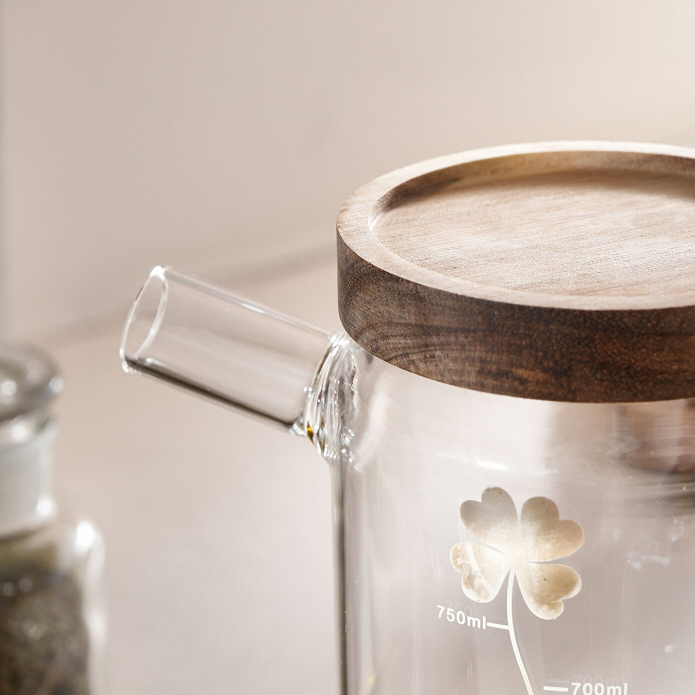 - Malzeme: Şeffaf cam gövde, doğal ahşap kapak.