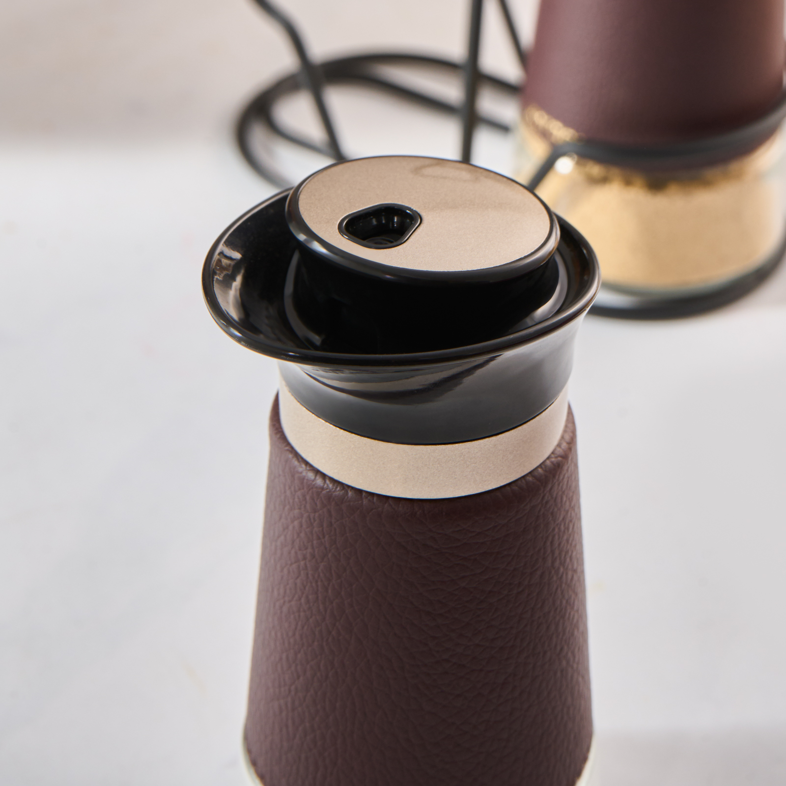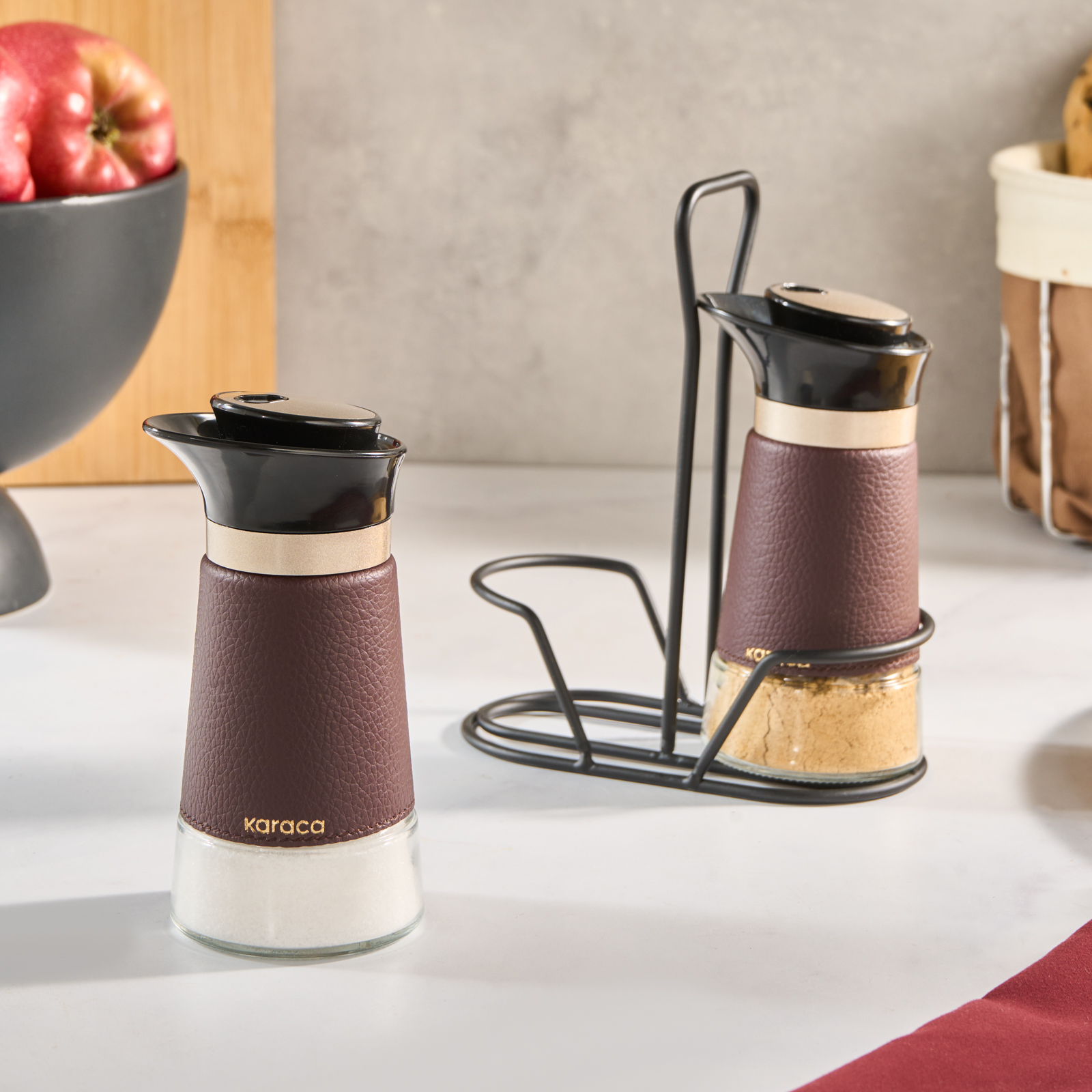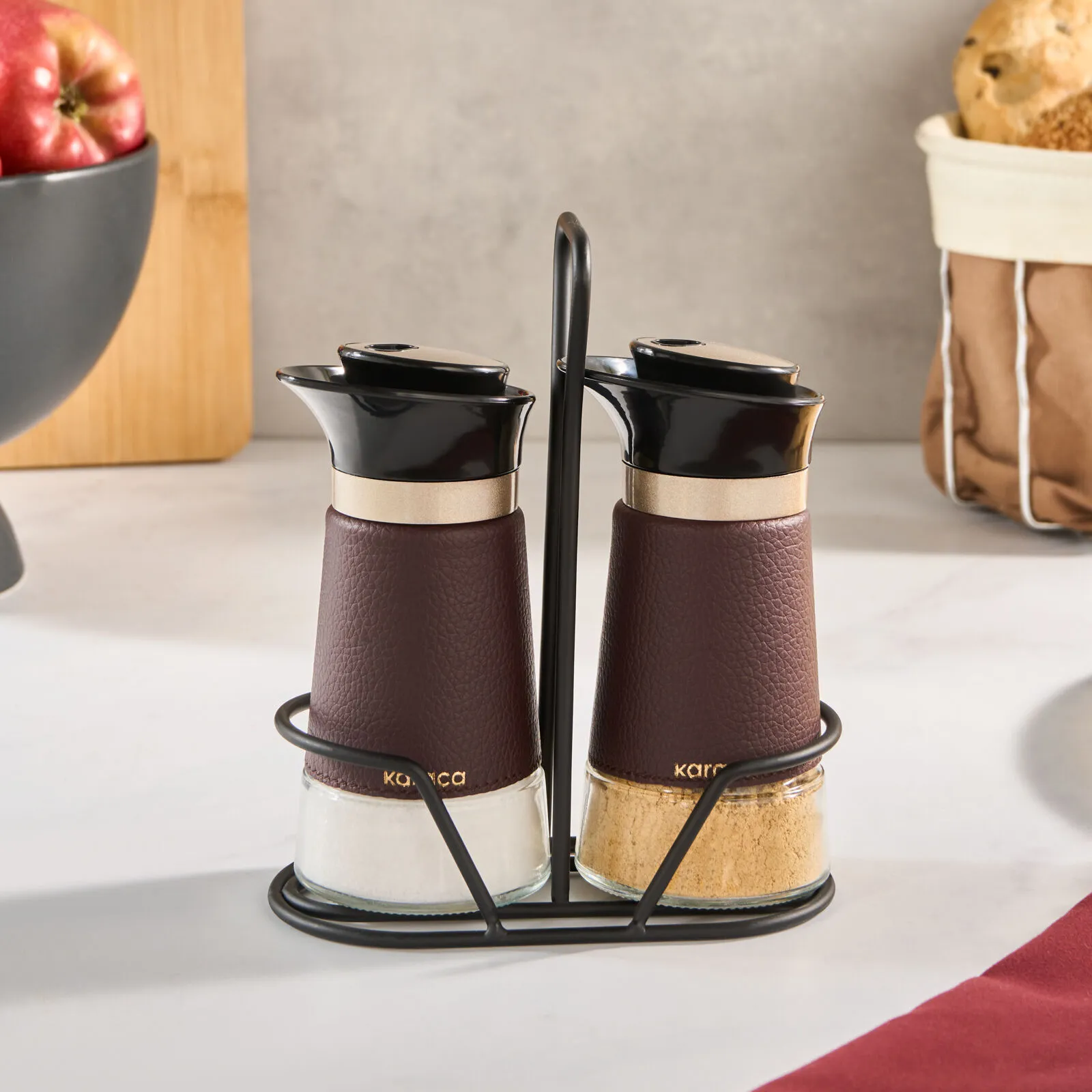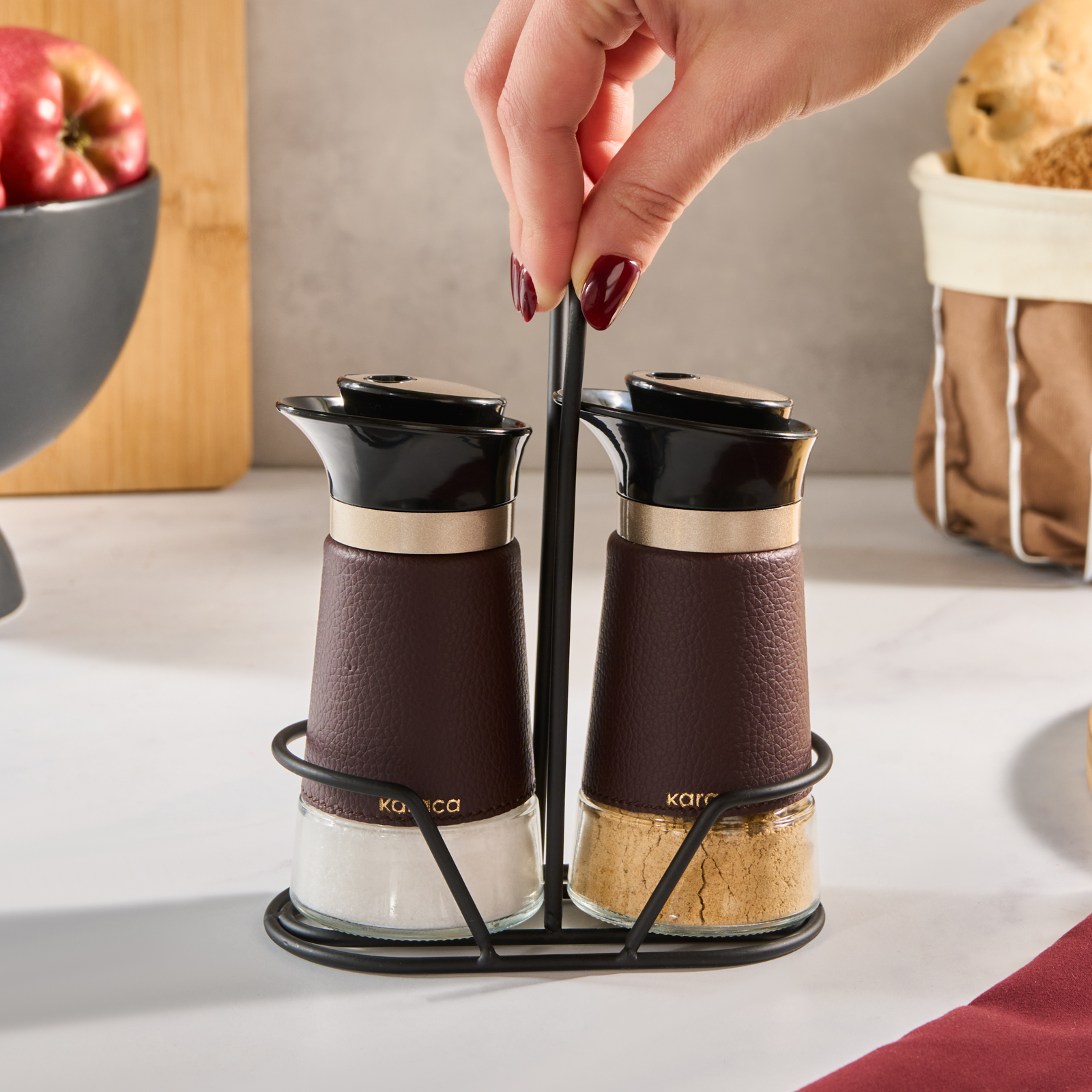 Şıklık ve işlevselliği bir araya getirerek, sofralarınıza zarif bir dokunuş katar. Modern tasarımı, deri dokulu yüzeyi ve gold detaylarıyla mutfağınıza estetik bir görünüm kazandırır. Pratik kapak sistemi sayesinde tuz ve baharatları kolayca kullanabilir, metal standı sayesinde düzenli bir şekilde saklayabilirsiniz.