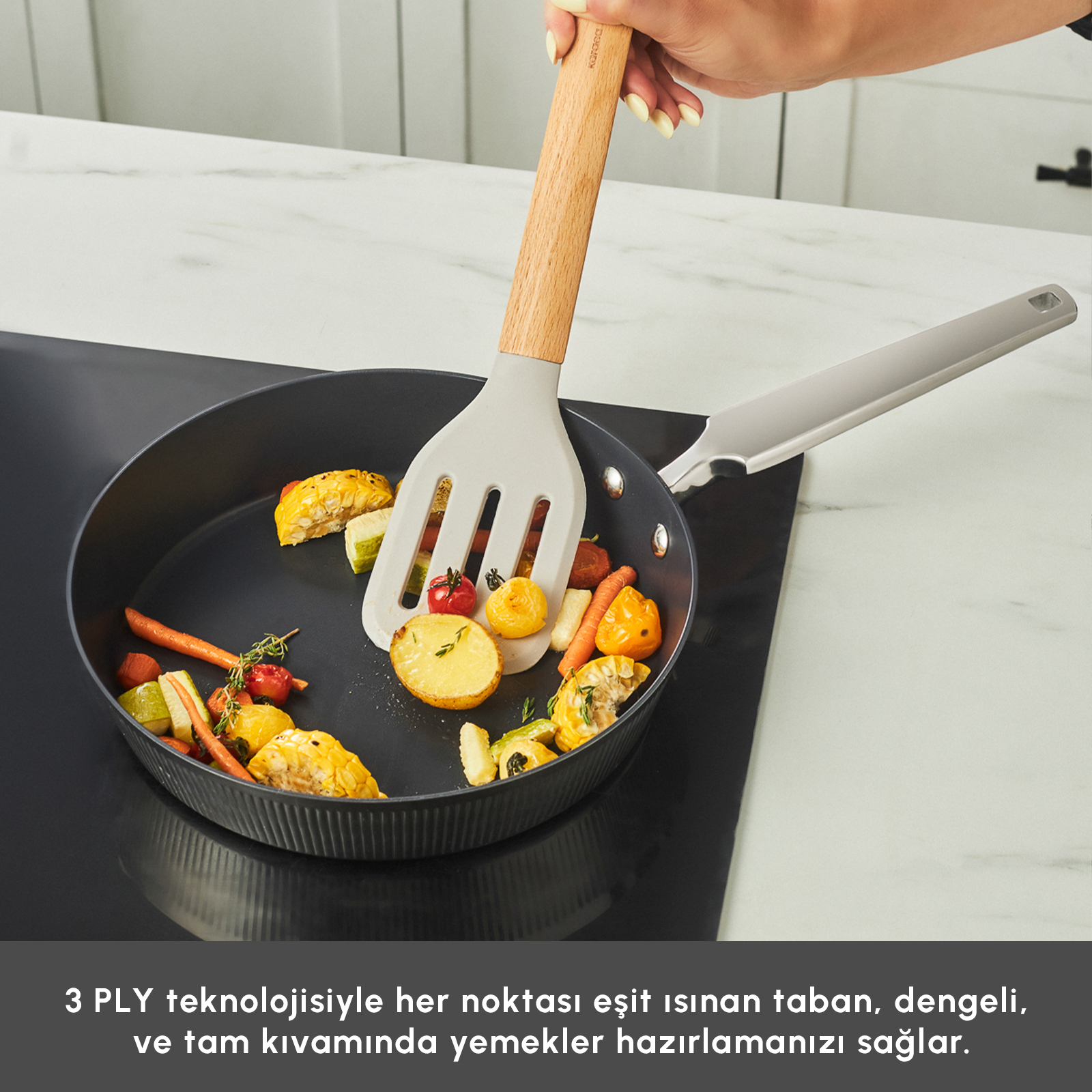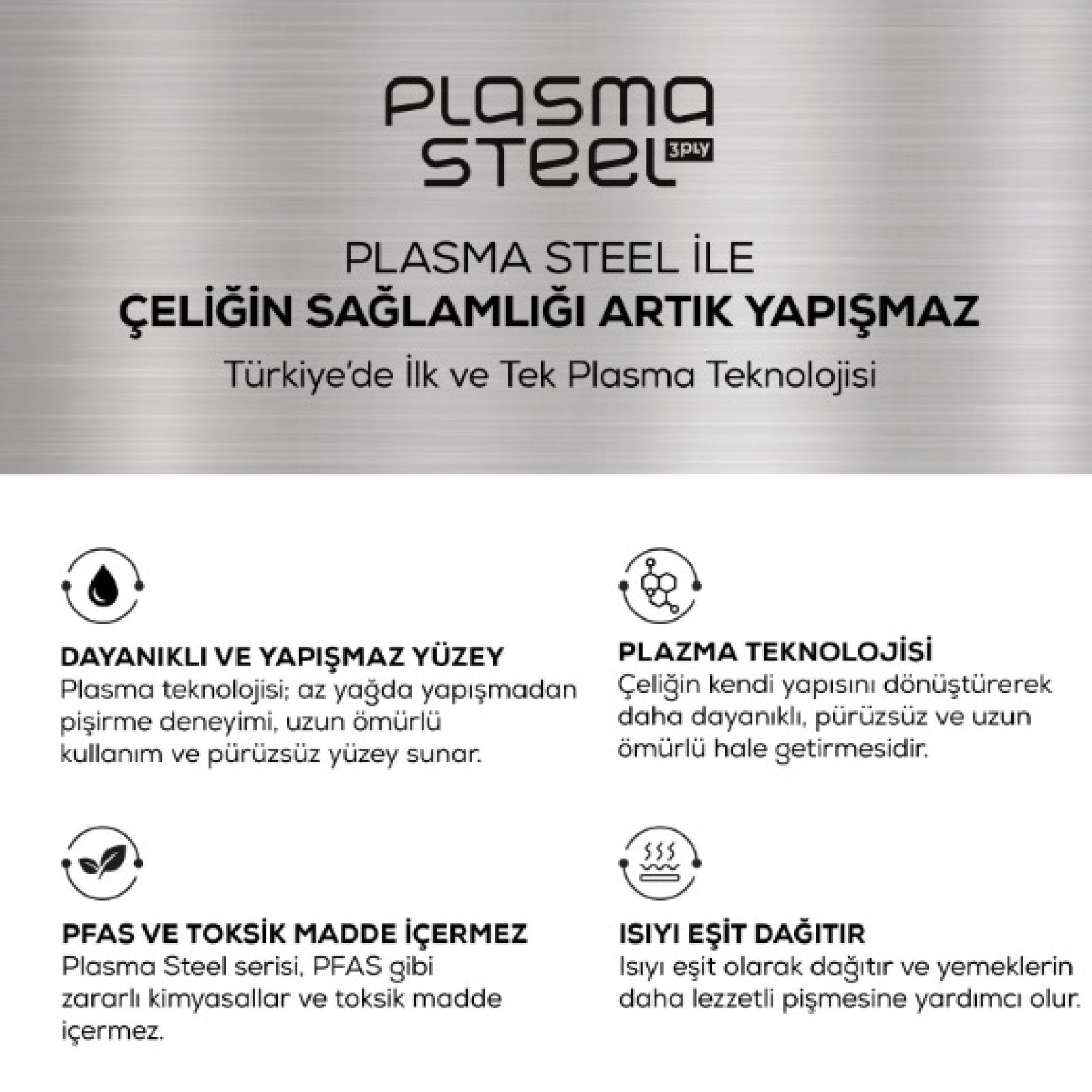 Ultra dayanıklı ve çizilmez özelliği sayesinde yemeklerinizi yaparken metal mutfak gereçlerini güvenle kullanabilirsiniz. Plasma Steel 3PLY 316+ serisi, üstün dayanıklılığıyla bilinen ve dünyaca ünlü saat markalarının da kullandığı 316 kalite paslanmaz çelikten üretilmiştir. Yüksek ısıya ve çizilmelere karşı maksimum direnç sunar; uzun ömürlü ve hijyeniktir.Üstelik insan sağlığını tehlikeye sokan PFAS gibi zararlı kimyasal maddeler içermez.