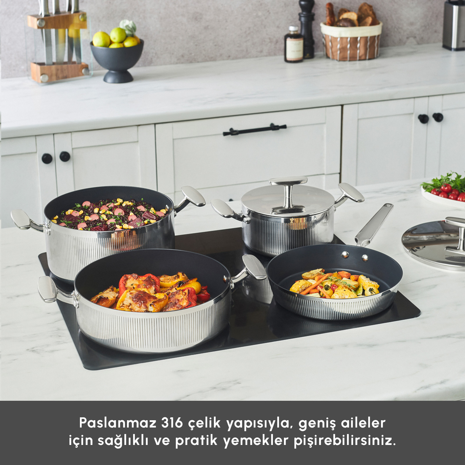 İndüksiyon dahil tüm ocak ve fırın kullanımlarına uygun olan Plasma Steel 3PLY 316+, mükemmel ısı geçirgenliği sayesinde ısıyı her tarafa eşit olarak dağıtır ve yemeklerin daha lezzetli pişmesine yardımcı olur. Bulaşık makinesinde yıkamaya uygun olanPlasma Steel 3PLY 316+ serisinin temizlenmesi de çok kolay!