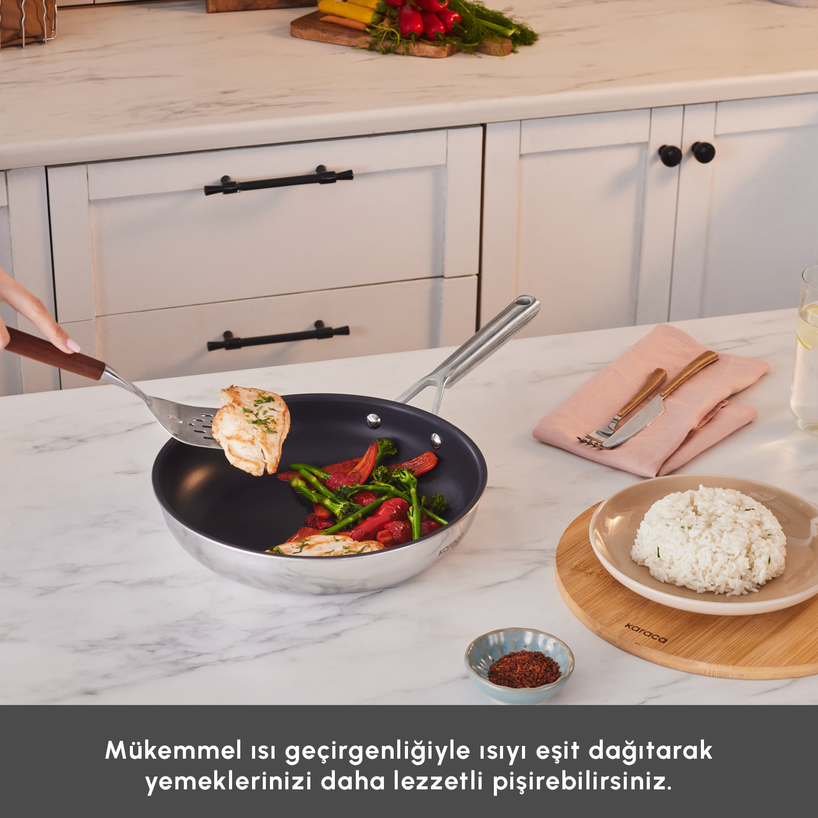 Çeliğin yapısını dönüştüren Plasma Teknolojisi ile geliştirilen Karaca Plasma Steel Ailesi, 316+ paslanmaz çelikten üretildi. Toksik madde ve PFAS içermez. Dayanıklılık, güvenli kullanım ve dengeli pişirme performansını bir araya getirir.