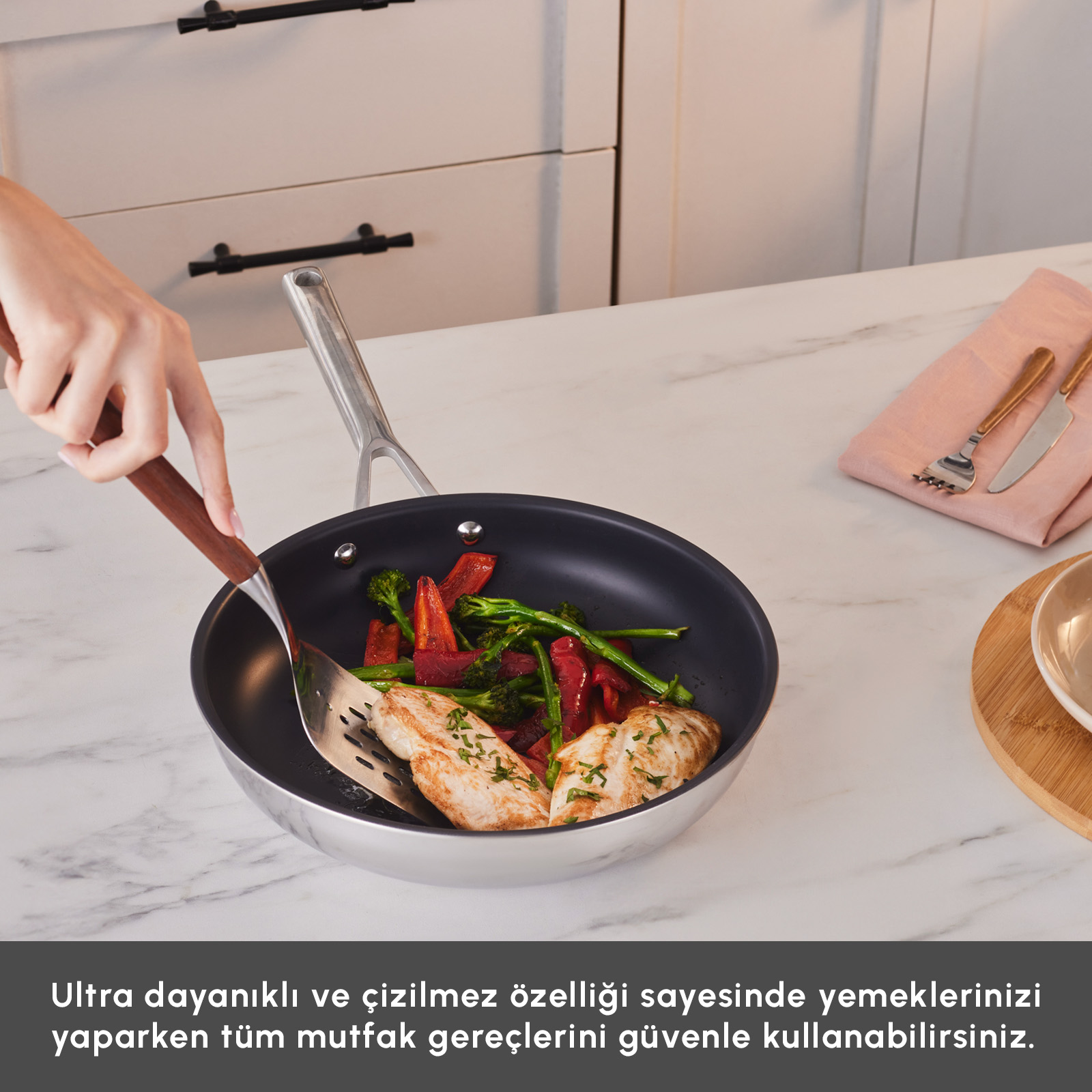 İndüksiyon tabanlı yapısı sayesinde indüksiyon dahil tüm ocak tiplerinde ve fırında kullanıma uygundur. Üç katmanlı gövdesi, ısıyı eşit şekilde dağıtarak pilav ve karnıyarık gibi yemeklerde ideal pişirme performansı sağlar. Bulaşık makinesinde yıkanabilir ve yapışmaz çelik yüzeyi sayesinde yalnızca ıslak bir bezle bile kolayca temizlenebilir.