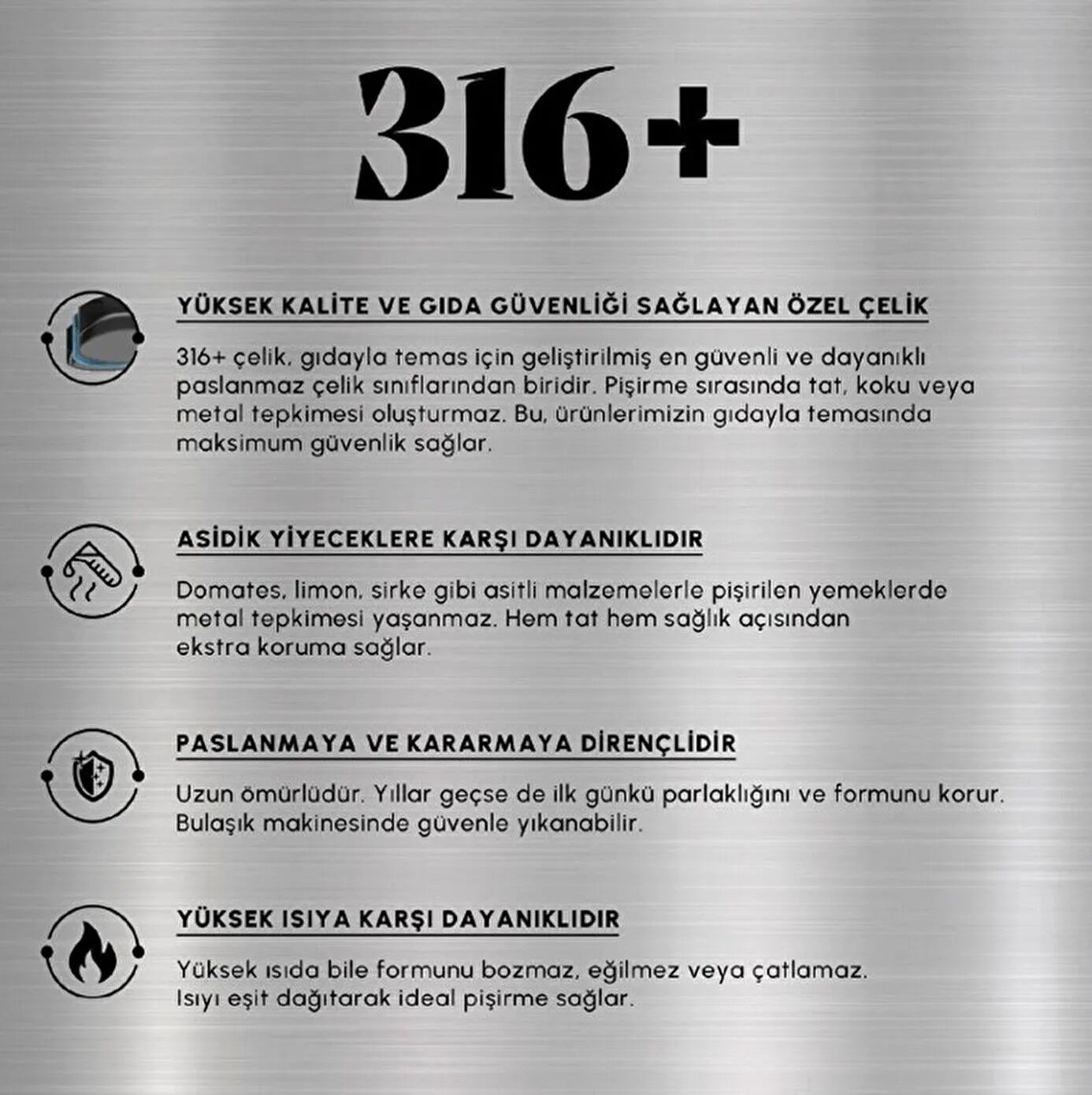 Karaca Plasma Steel 3Ply 316+, çeliğin kendi yapısını dönüştürerek daha dayanıklı, pürüzsüz ve uzun ömürlü hale getiren özel Plasma Teknolojisi ile üretilmiştir. Bu teknoloji sayesinde çeliğin sağlamlığı artırılarak üstün çizilmezlik performansı elde edilir. Metal mutfak gereçlerine karşı maksimum direnç gösteren Karaca Plasma Steel 3Ply 316+, pilav ve karnıyarık gibi hassas yemeklerde dahi güvenle kullanılabilir.