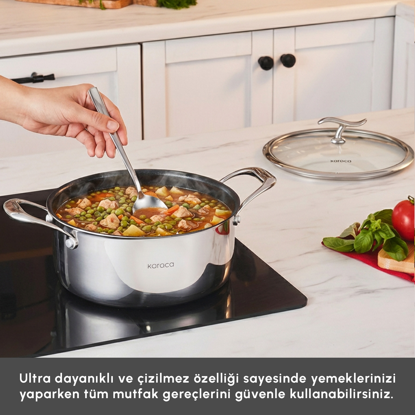 Çeliğin yapısını dönüştüren Plasma Teknolojisi ile geliştirilen Karaca Plasma Steel Ailesi, 316+ paslanmaz çelikten üretildi. Toksik madde ve PFAS içermez. Dayanıklılık, güvenli kullanım ve dengeli pişirme performansını bir araya getirir.