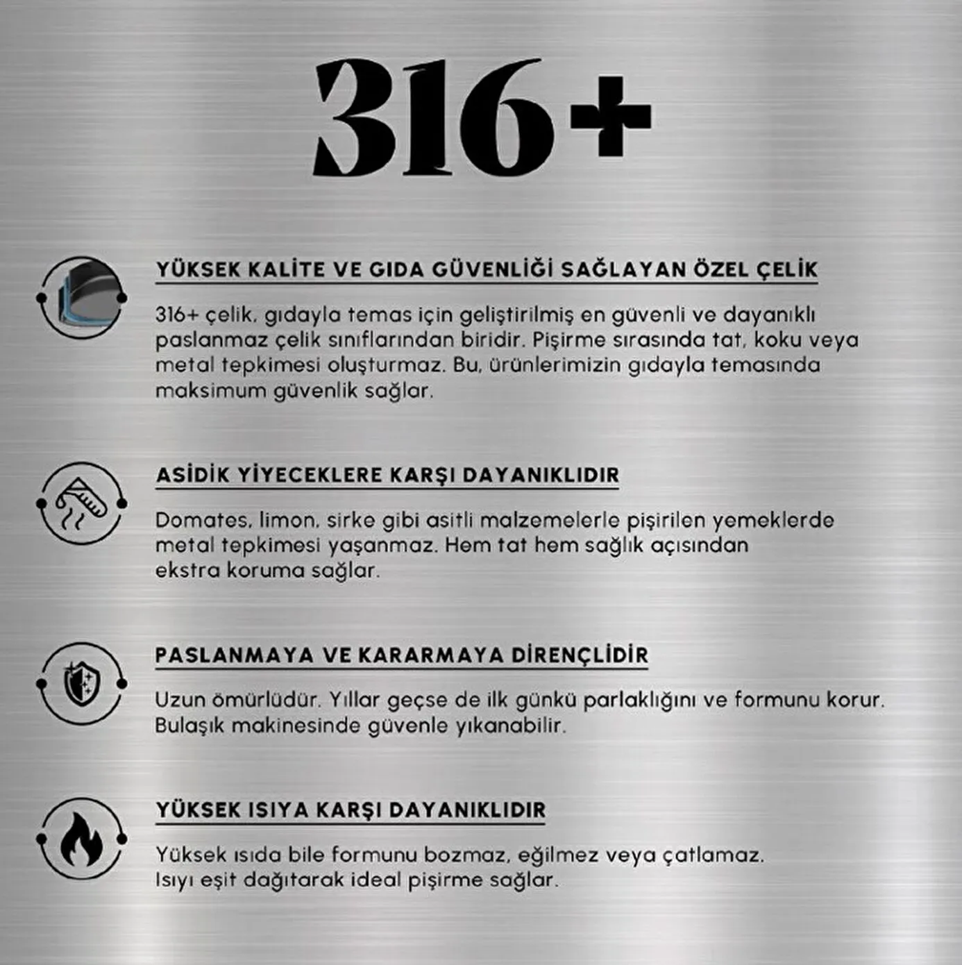 Bu özel seri, dünyaca ünlü saat markalarının da tercih ettiği 316+ kalite paslanmaz çelikten üretilmiştir. Plasma Teknolojisi ile güçlendirilmiş iç yüzeyi ve indüksiyon tabanı 316+ çelik yapısıyla ısıya ve çizilmelere karşı maksimum direnç sunar. 3Ply üç katmanlı gövde, ısıyı taban ve yan yüzeylere eşit şekilde ileterek yemeklerin dengeli, hızlı ve lezzetli pişmesini sağlar. Uzun ömürlü ve hijyenik kullanım sunar.
