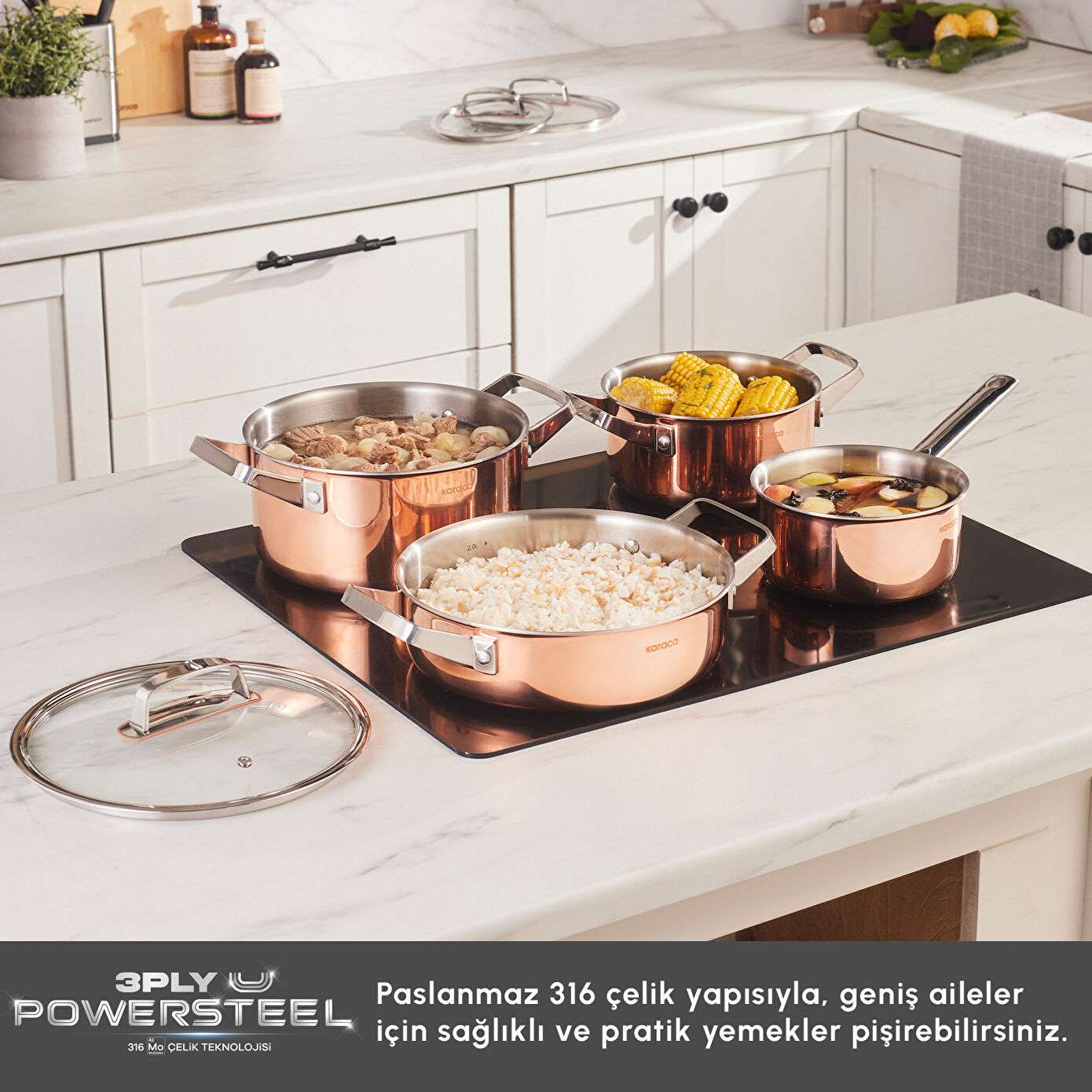 Yemeklerin lezzetine lezzet katan ve sağlamlığıyla mutfağın vazgeçilmezi olan 3 PLY PowerSteel Serisi, tabandan tencere ağzına kadar yekpare formda tasarlandı. Alt katmanı indüksiyon çelik, orta katmanı tencerenin ağız kısmına kadar alüminyum, üst katmanıysa doğadaki en dayanıklı elementlerden biri olan molibden ile güçlendirilmiş 316 paslanmaz çelik olmak üzere 3 farklı katmandan oluşuyor.
