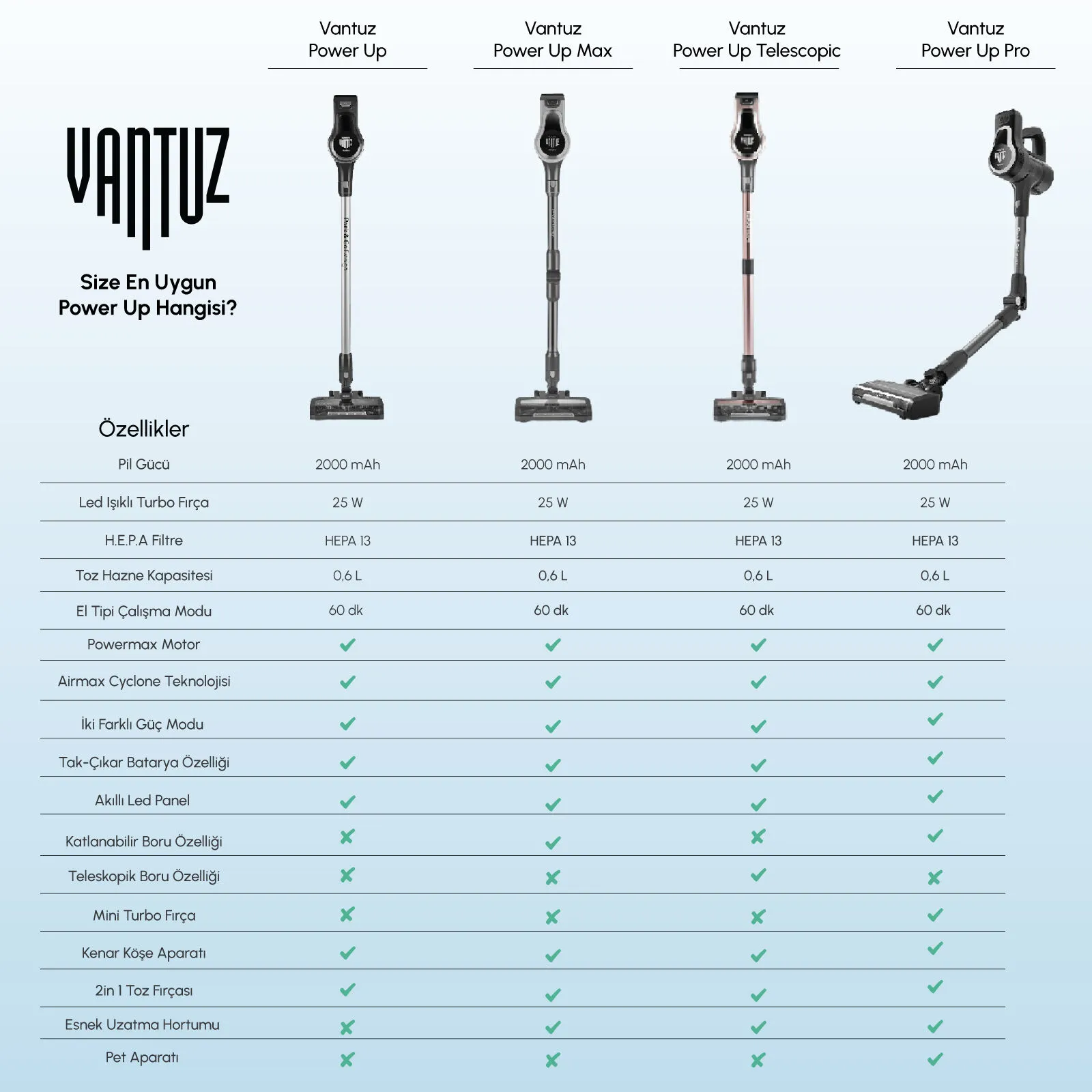 - Vantuz Power Up Pro, geliştirilmiş Powermax motor teknolojisi sayesinde tüm zeminlerde yüksek çekim gücü ile kusursuz temizlik sağlar.