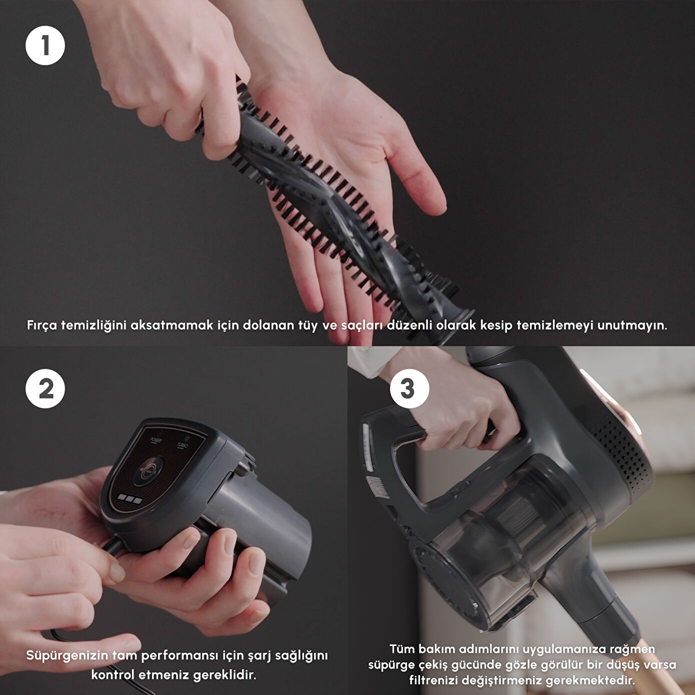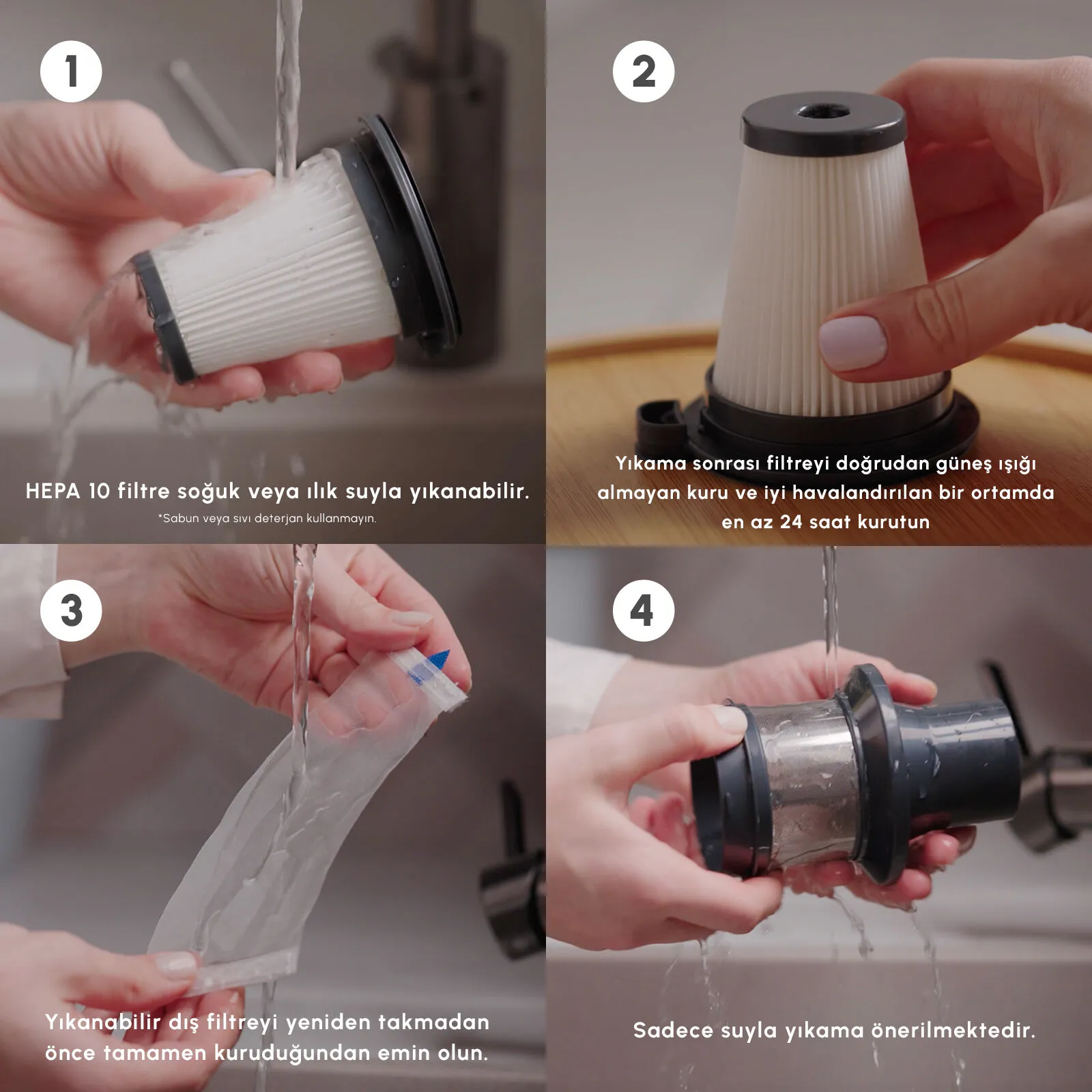 - 3 aşamalı HEPA, metal ve sünger katmanlı filtre sistemi sayesinde partiküllerin %99’unu hapsederek derinlemesine temizlik yapar.