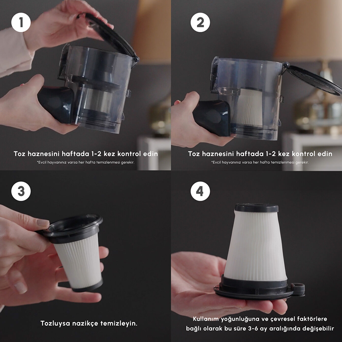 - 0,6 litrelik kolay çıkarılıp takılabilen toz haznesi tek tuşla etrafa toz dağılmadan daha hijyenik bir şekilde boşaltılabilir.