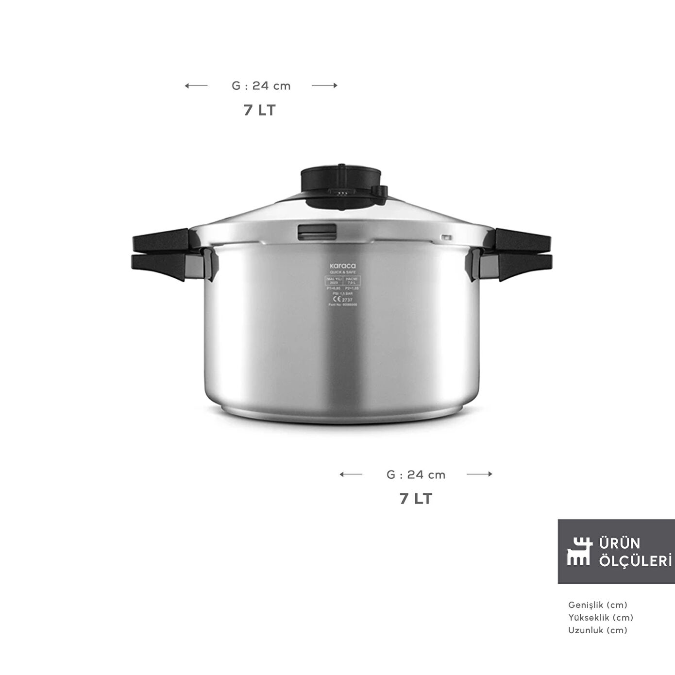 Karaca Quick & Safe düdüklü tencere, 7 litrelik geniş hacmiyle aile yemeklerinizi pratik ve lezzetli hale getirir. Sağlam paslanmaz çelik yapısı ve gelişmiş güvenlik sistemleriyle hem dayanıklı hem de kullanıcı dostudur.