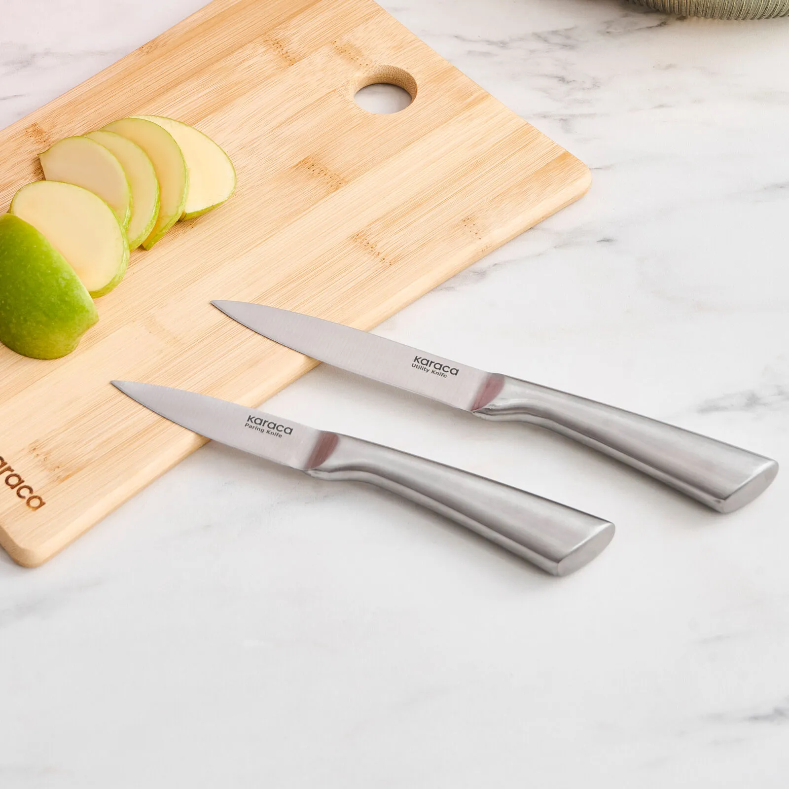 Mutfakta şıklığı ve fonksiyonelliği bir araya getiren bu 6 parçalı bıçak seti, günlük kullanım için ideal tasarımıyla öne çıkıyor. Performer çeliği ile üretilmiş bıçaklar, uzun ömürlü keskinlik ve dayanıklılık sunar. Saplarının konforu sayesinde güvenli ve konforlu bir tutuş sağlar.