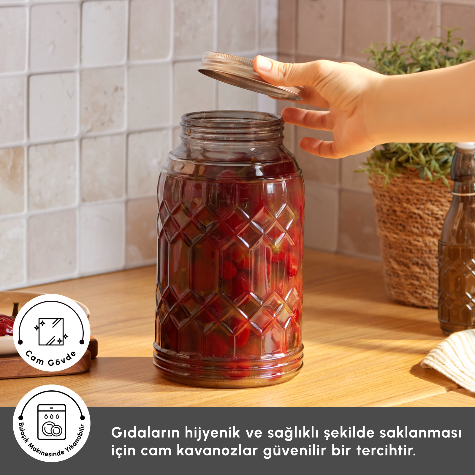 Günlük kullanım için ideal olan bu cam kavanoz, sade tasarımı ve fonksiyonel yapısıyla hem mutfağınızda estetik bir görünüm sunar hem de gıdalarınızı güvenle saklamanıza yardımcı olur.