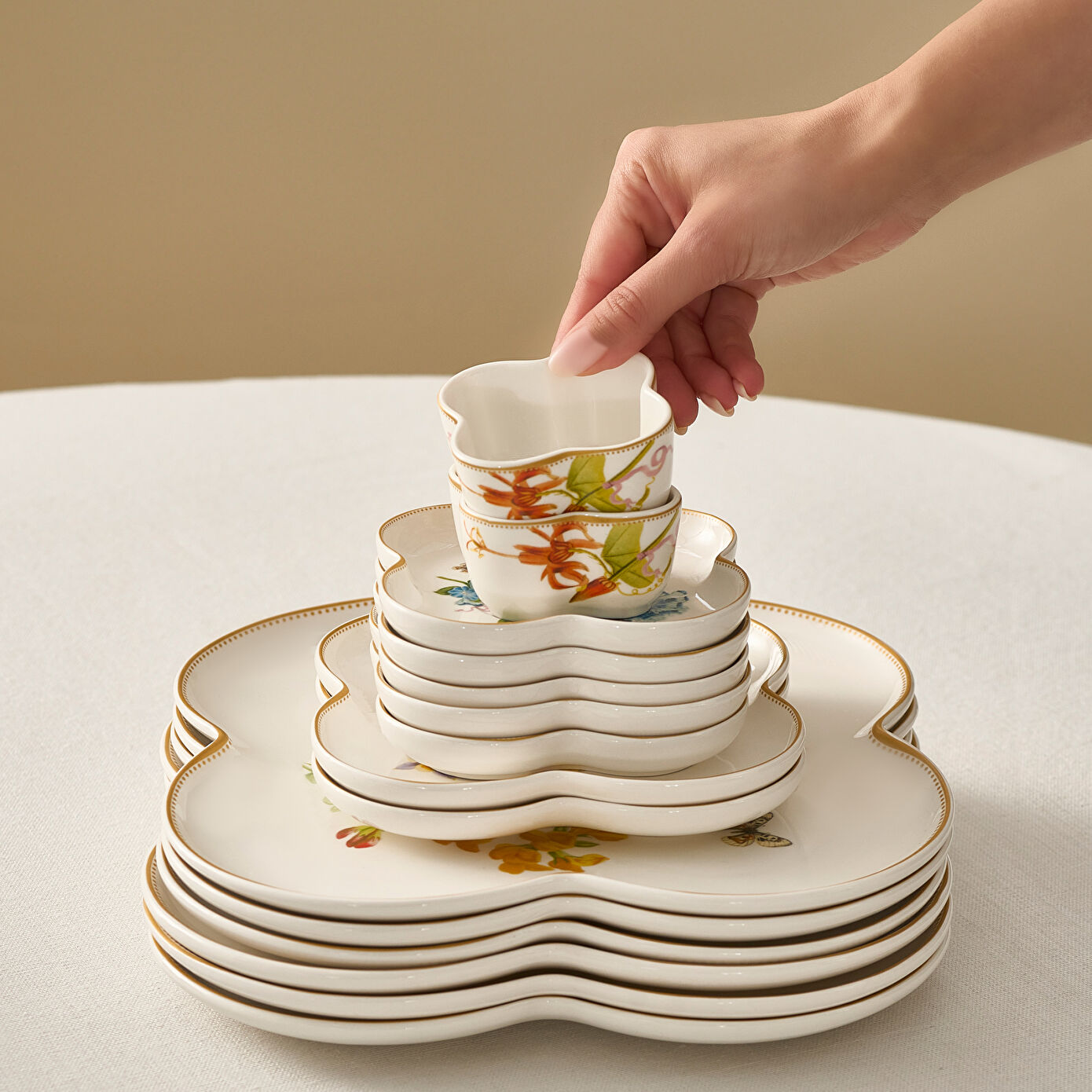 Modern formu ve zarif desenleriyle her öğünü özel bir ana dönüştürür.Dayanıklı bone porselen malzemesi, hem şık hem de uzun ömürlü kullanım sunar. 6 kişilik kapasitesiyle günlük sofralardan özel davetlere kadar her anınıza eşlik eder.