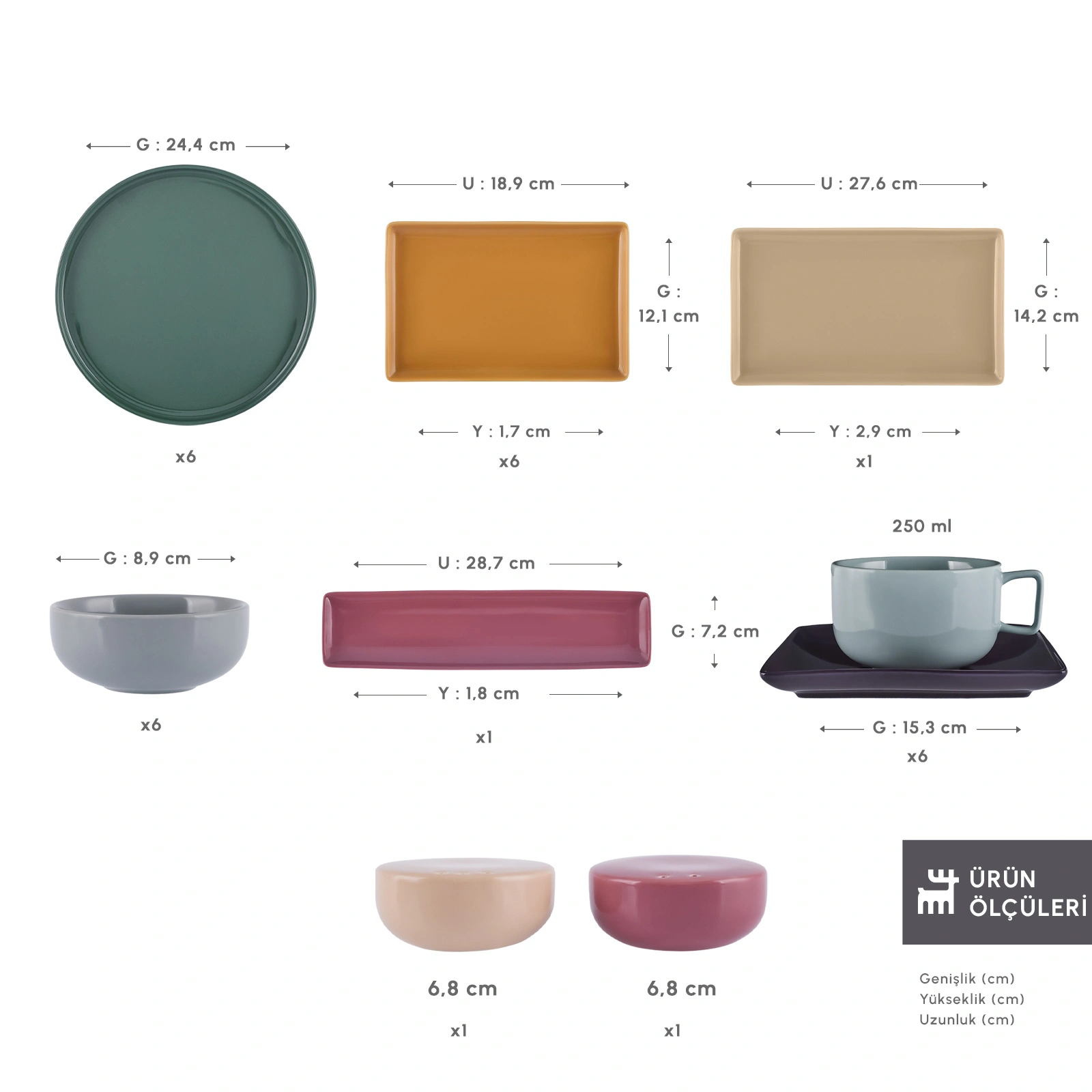 - 6 adet pasta tabak : 24.5 x 24.4 x 2.1 cm (Uzunluk x Genişlik x Yükseklik)