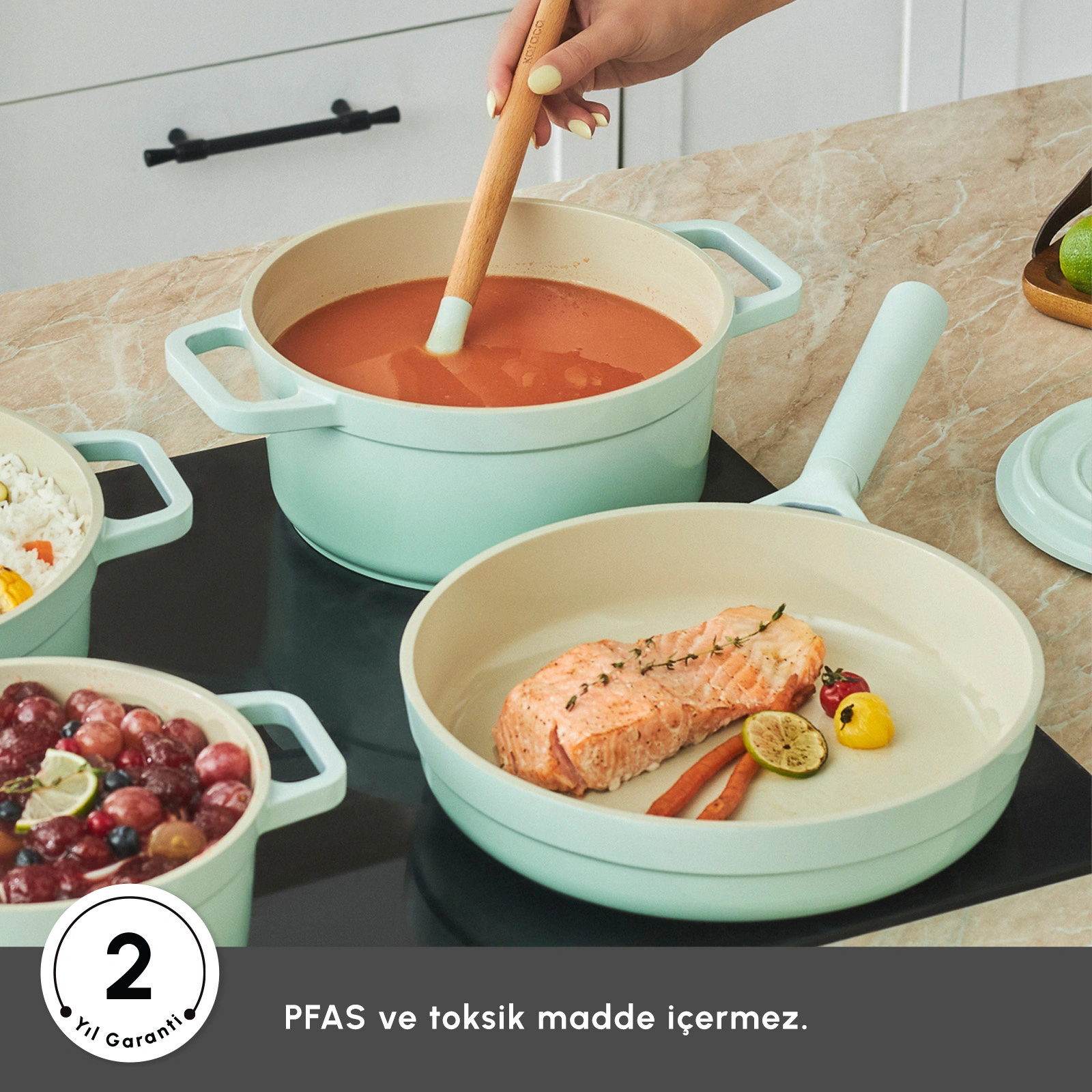 PFAS ve Zararlı Kimyasallar İçermez: Swiss kristallerden oluşan yapışmaz yüzeyi; insan sağlığını tehlikeye sokan “PFAS” gibi zararlı kimyasal maddeler içermez.