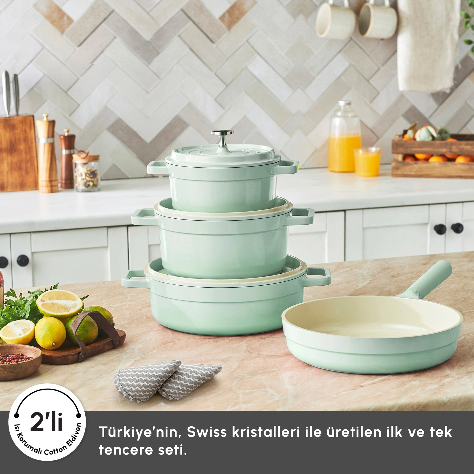 Set içerisinde bulunan 2 adet özel pamuklu eldiven sayesinde sıcak kulpları güvenle tutabilirsiniz.