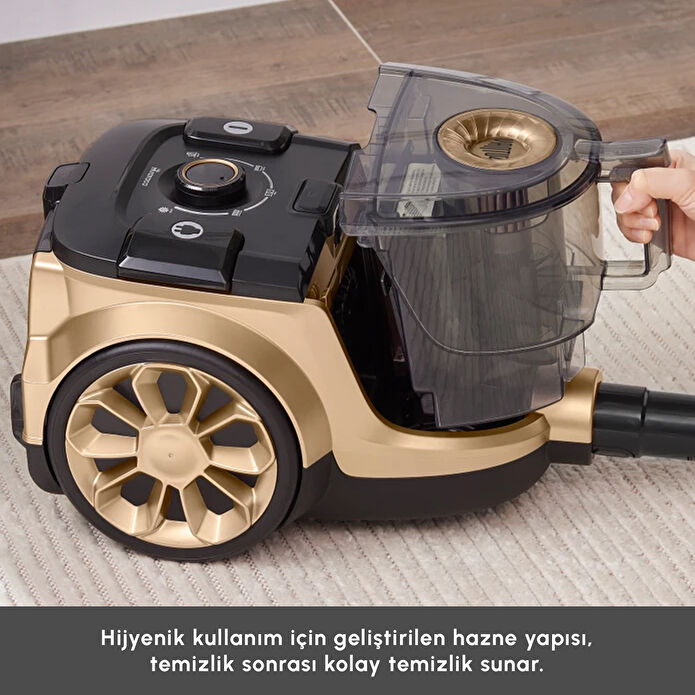 - Quick Clean Toz Haznesi ergonomik hazne açma tuşu ile toz haznesini tek tuş ile yerinden çıkarıp, tek hareket ile tozları etrafa dökmeden kontrollü bir biçimde boşaltabilirsiniz.
