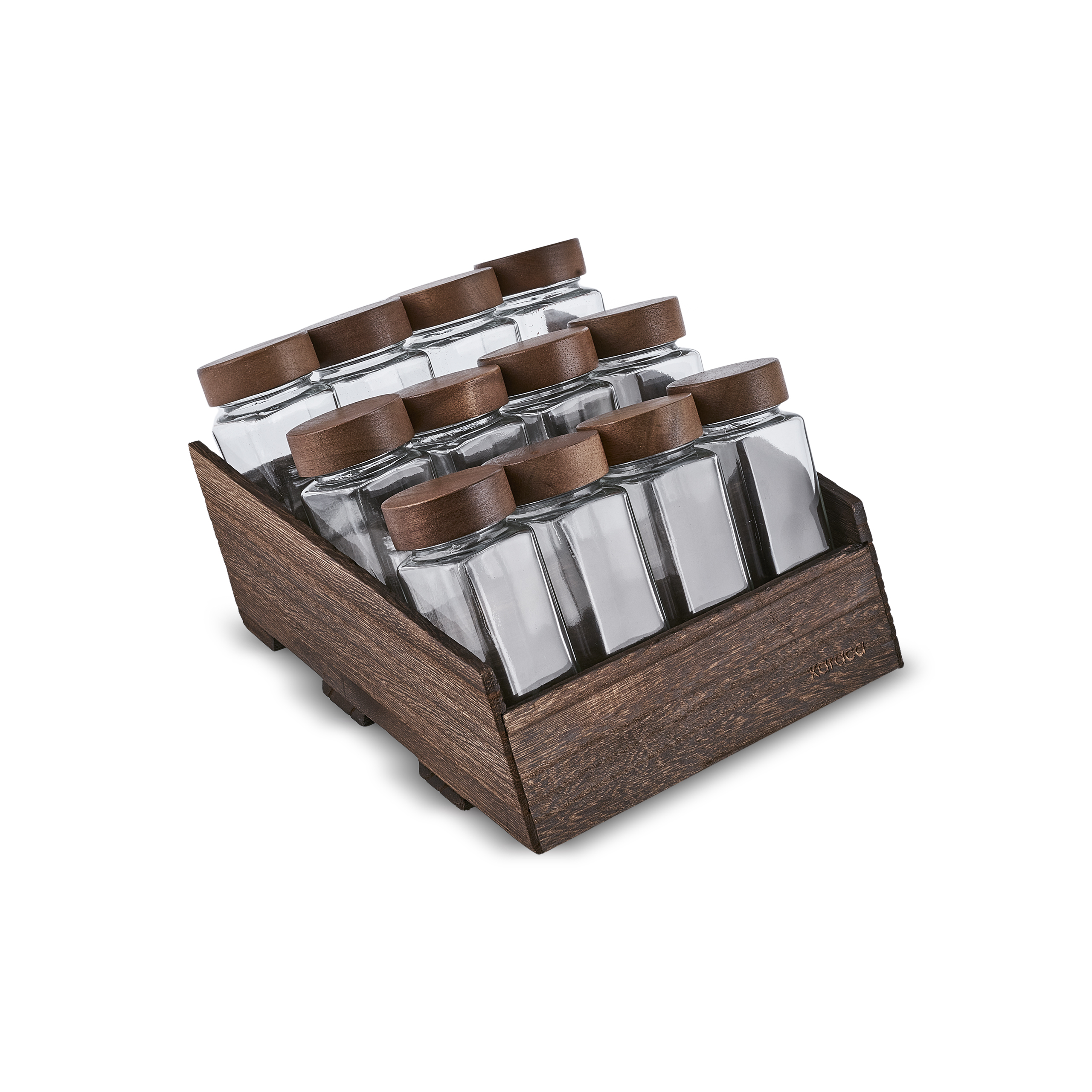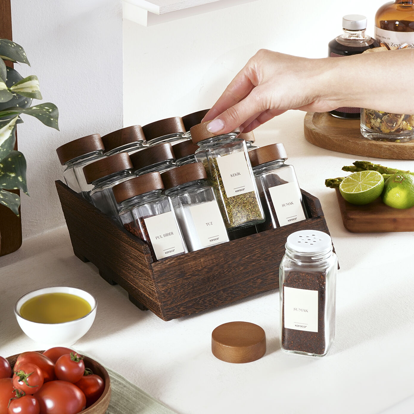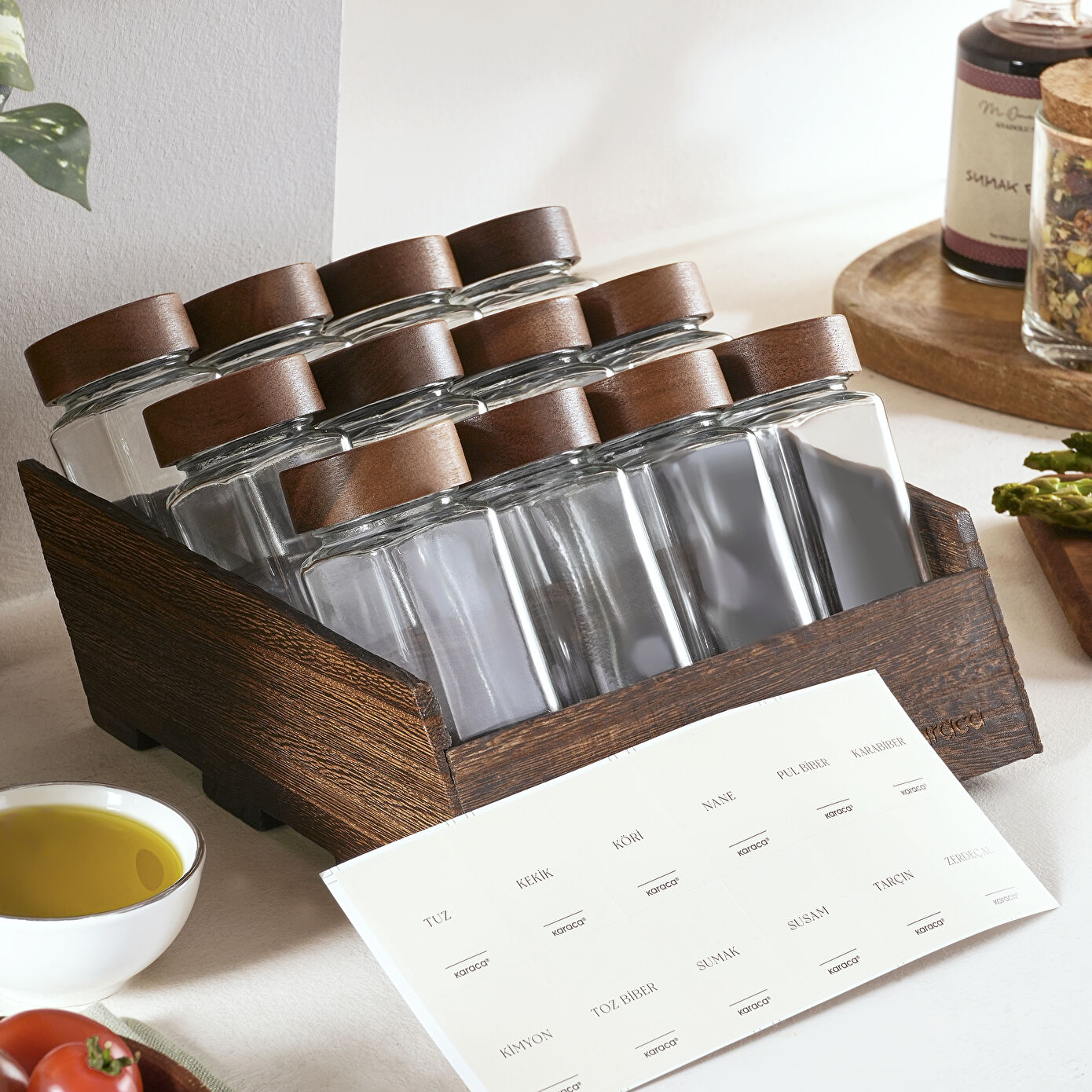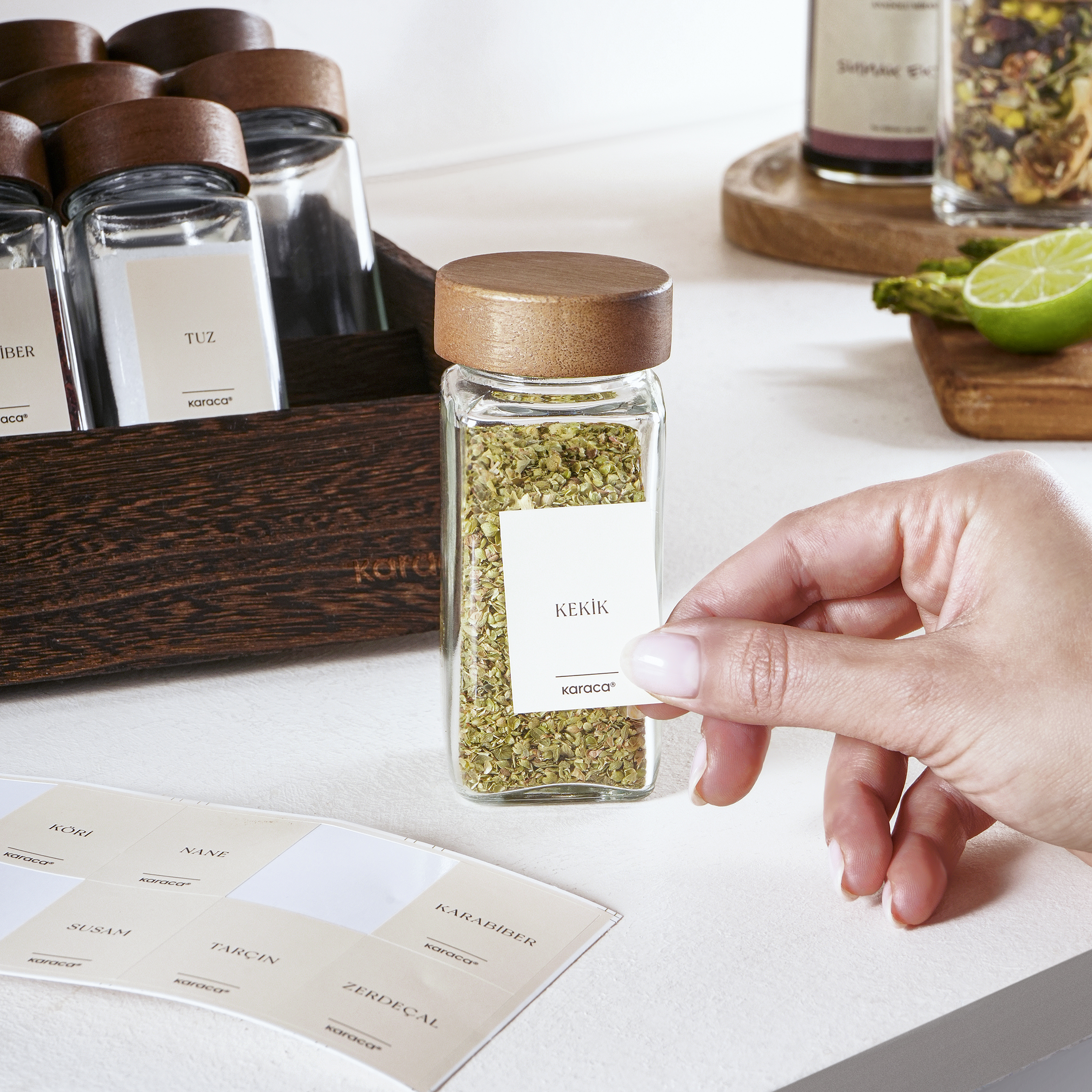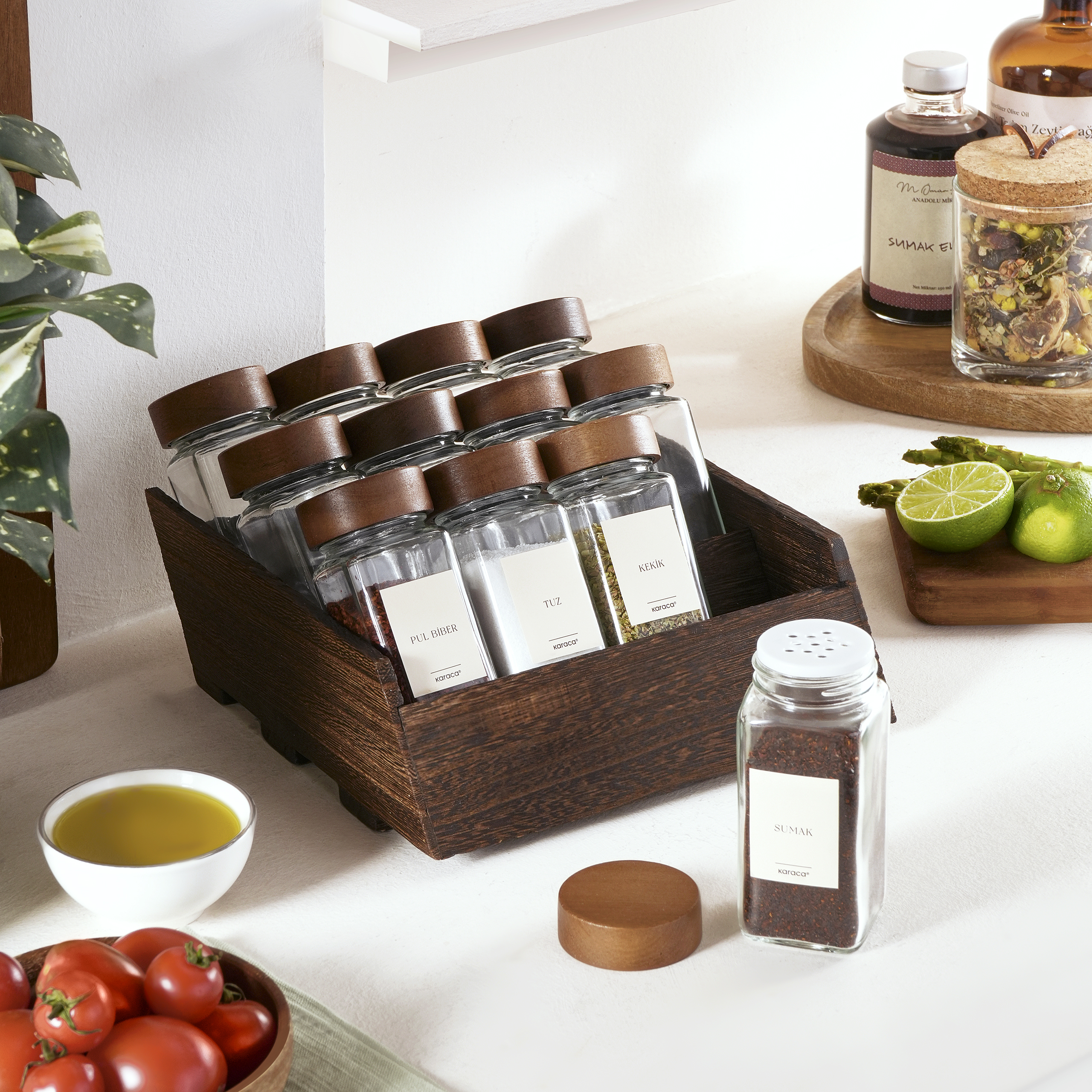 Toplam: 12 adet kavanozdan oluşan set ve 12 etiket (Pul biber, Sumak, Kori, Nane, Tuz, Karabiber, Kimyon, Toz biber, Kekik, Susam, Tarçın, Zerdeçal)