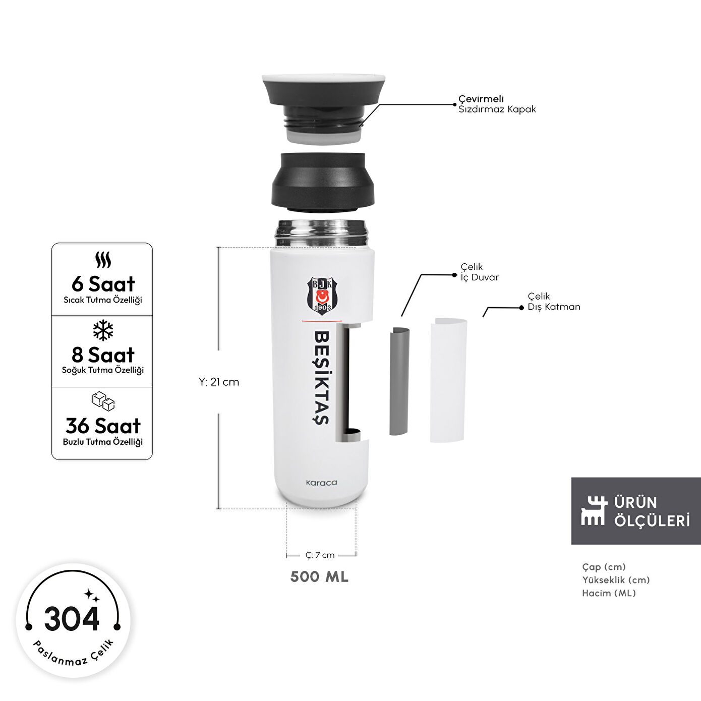 Karaca Beşiktaş Termos, 304 kalite paslanmaz çelik iç haznesi sayesinde sağlıklı ve uzun ömürlü bir kullanım sunar. 6 saat sıcak ve 8 saat soğuk tutma özelliğine sahiptir. İçeceklerinizi sızdırmaz, böylelikle gün boyu güvenle taşınabilir.