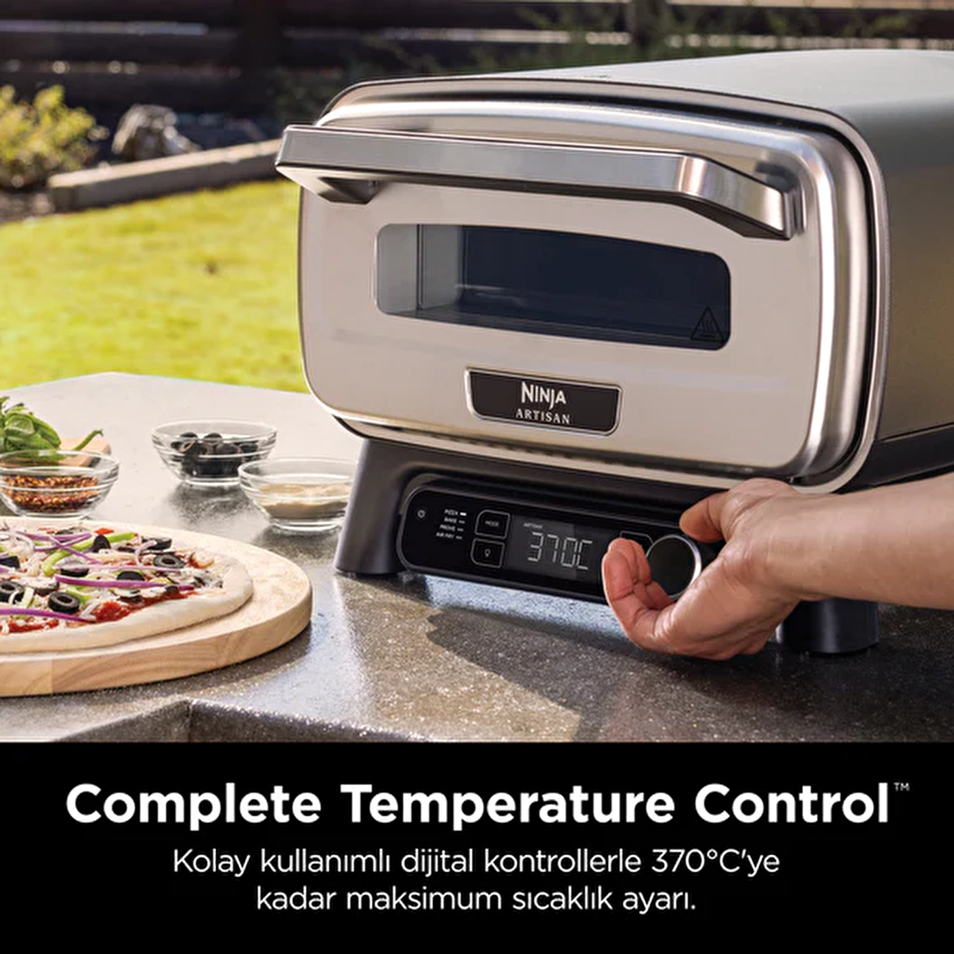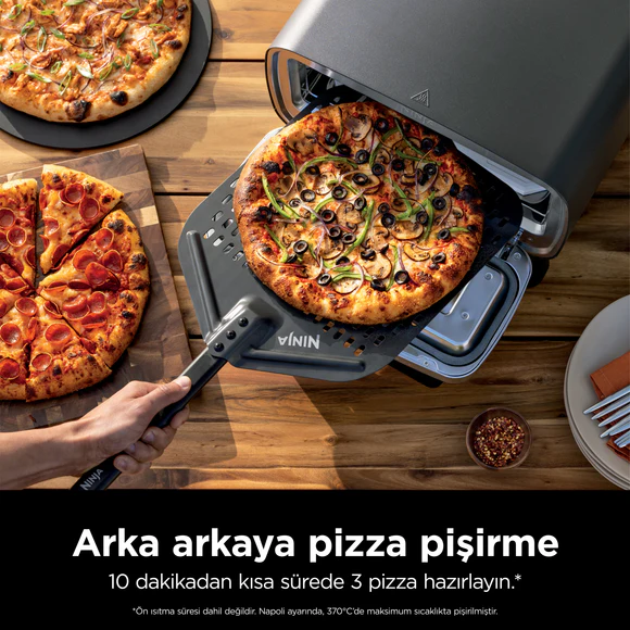 Yeni Ninja Artisan Elektrikli Dış Mekan Pizza Fırını & Air Fryer ile tanışın. Pizzanızı çevirmenize gerek kalmadan sadece 3 dakikada* mükemmel sonuç alın. Tek tuşla eşit pişirme sağlayan bu 4’ü 1 arada cihaz; Pizza, Fırın, Air Fry ve Mayalama (Prove) fonksiyonlarıyla dış mekan keyfinizi bir üst seviyeye taşıyor. Üstelik içinden çıkan Pizza Küreği ile ekmek ve pizzalarınızı fırına kolayca alıp çıkarın.