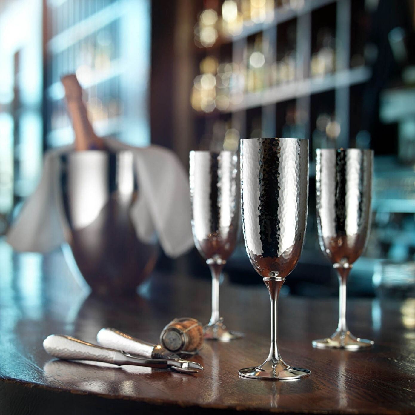 Gümüşün yüksek termal iletkenliği, Robbe & Berking'in Martelé şampanya kadehinin içeceğin sıcaklığına hemen adapte olmasını sağlar, son derece ferahlatıcı ve uzun süreli içme keyfi sunar. Gümüşün parlaklığı, özel içeceklerinizin ışıltısını ve güzelliğini hiçbir şeyin yansıtamadığı gibi yansıtır. Sonuçta, gözler için bir şölen olan sadece yemekler değildir, içecekler de eşit derecede cazip olmalıdır. Ve bir kristal bardak kurutulurken bir anlık dikkatsizlik ile kırılabilirken, Robbe & Berking gümüş kaplı bardaklar asla kırılmaz.