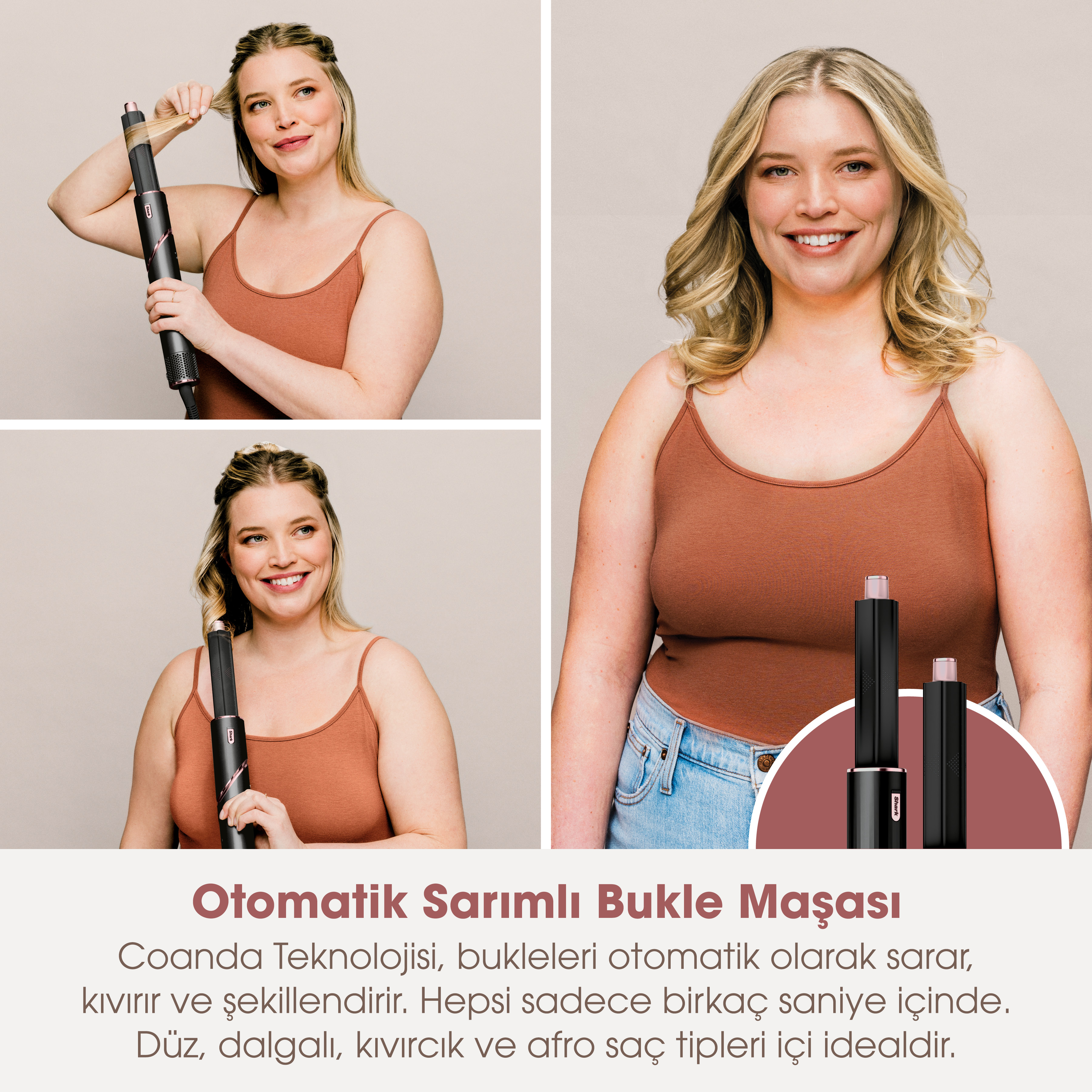 Otomatik Sarımlı Bukle Maşası (Auto-Wrap Başlık): Coanda Teknolojisi, saçı gövde etrafına sarmak için hava gücünü kullanarak otomatik olarak sarar ve kıvırır. Tutamlara ayırdığınız saçınızı maşa başlığına yakınlaştırdığınızda özel teknolojisi saçınızı otomatik olarak sarar ve saniyeler içinde kusursuz bukleler oluşturur. İki ayrı bukle maşası ile saçlarınızı her iki yönde de kıvırarak yüzünüzü simetrik olarak çerçeveleyen bir görünüm elde edin.